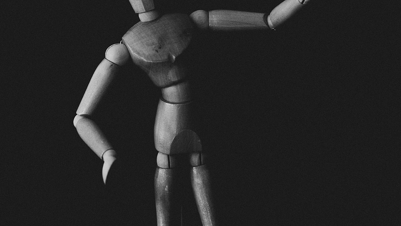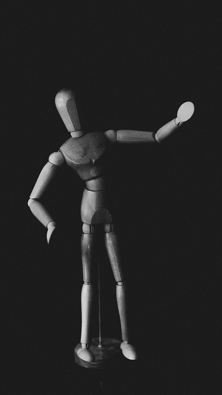 Keywords: black and white, monochrome, wooden figure, wood carving, figurine, sculpture, art, craft, handmade, rustic, vintage, antique, minimalist, simple, photography