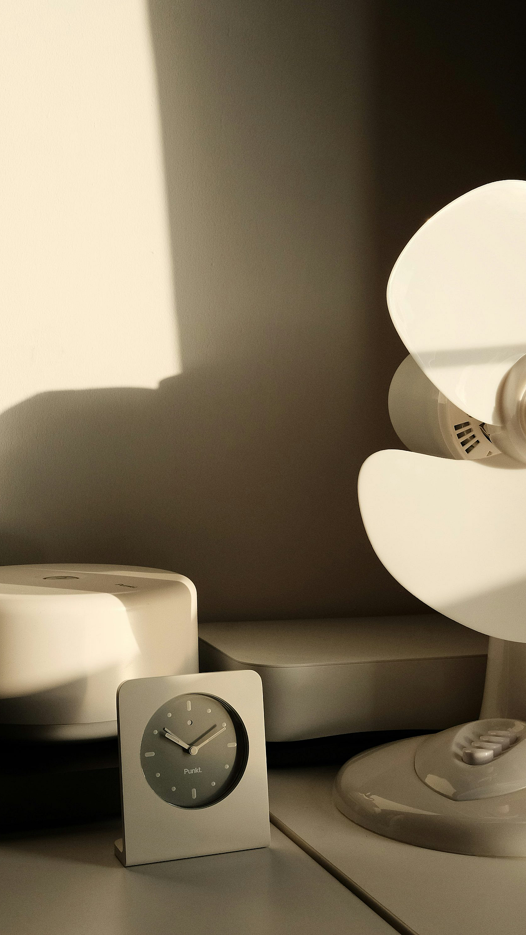 clock, lamp, table, wallpaper, timepiece, lighting, furniture, still life, interior design, home decor, nightstand, bedside table, desk lamp, clock face, ambient lighting