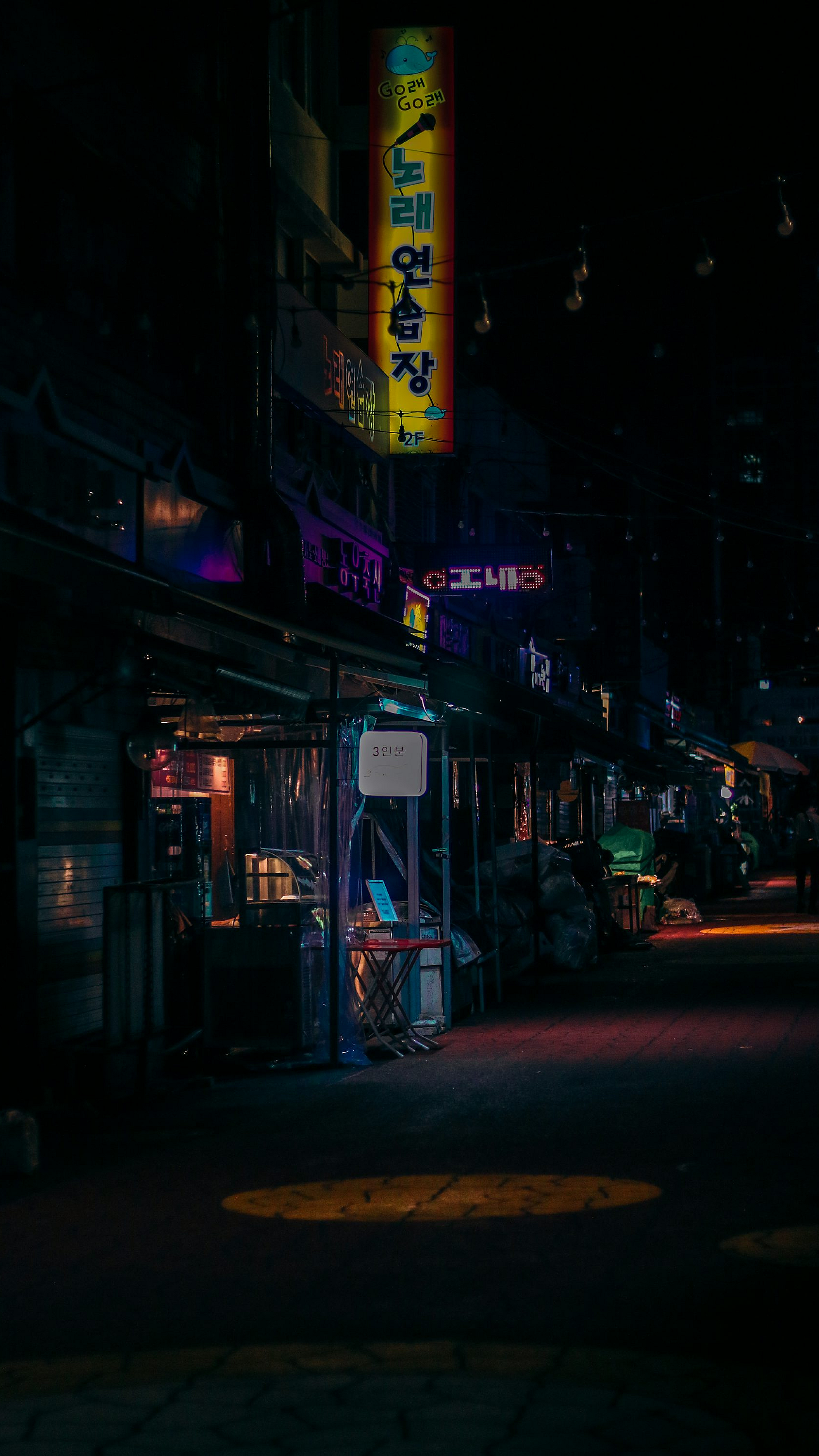 dark, city, street, night, neon, signs, urban, cityscape, metropolis, nocturnal, illuminated, glowing, shadows, alleyway, backstreet