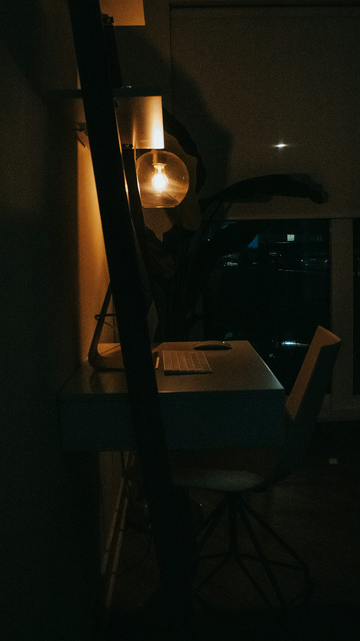 dark room, desk, lamp, wallpaper, study, office, night, shadow, light, illumination, interior, workspace, ambient, atmosphere, gloomy