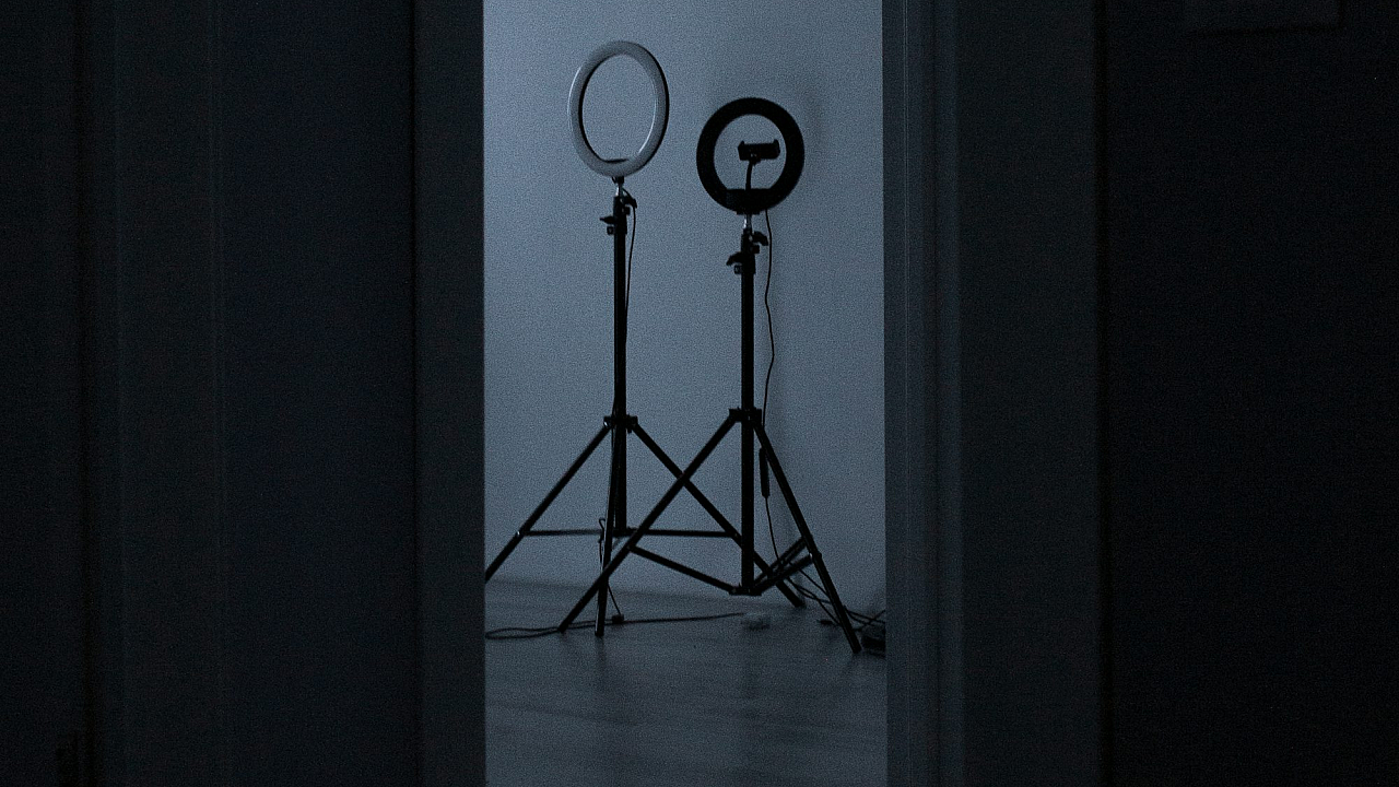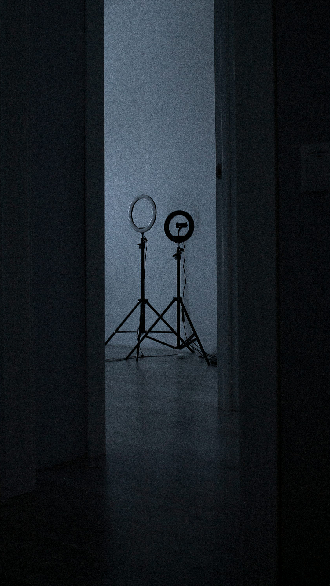 This wallpaper features a dark room, illuminated only by two lights, creating a dramatic and moody atmosphere. A tripod is subtly positioned in the scene, suggesting a photographic setup. The overall effect is cinematic and mysterious, perfect for those who appreciate low-key lighting and dark aesthetics.