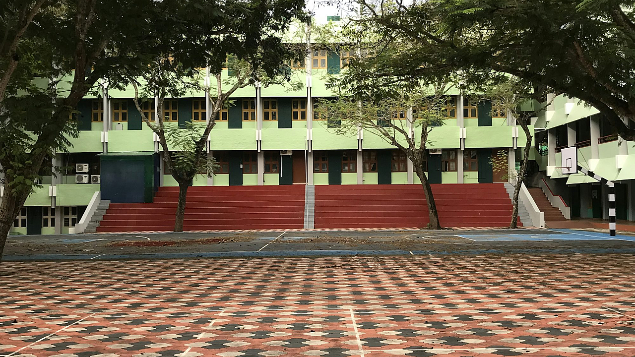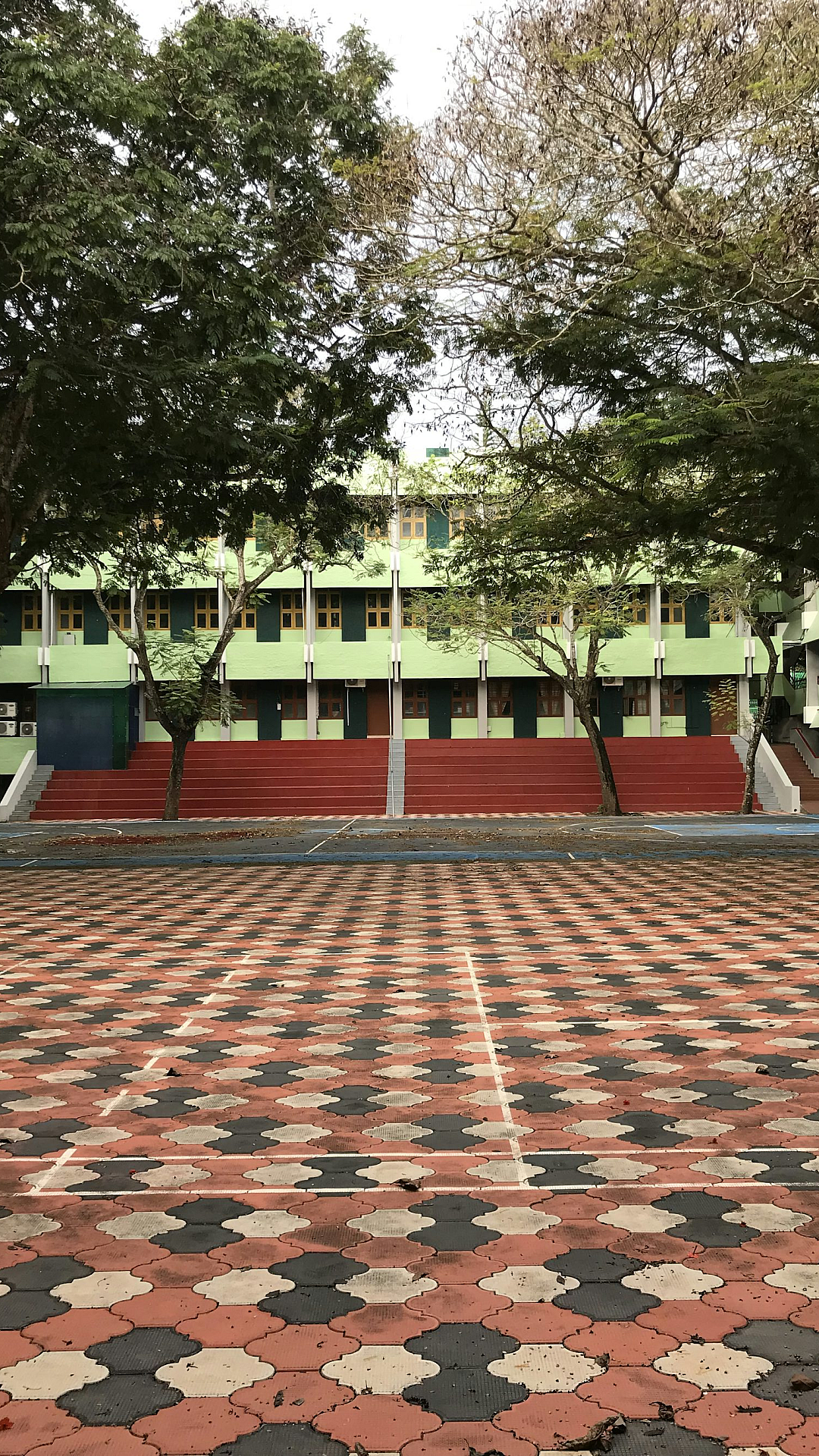 Wallpaper A Large Building with a Red and White Checkered Floor