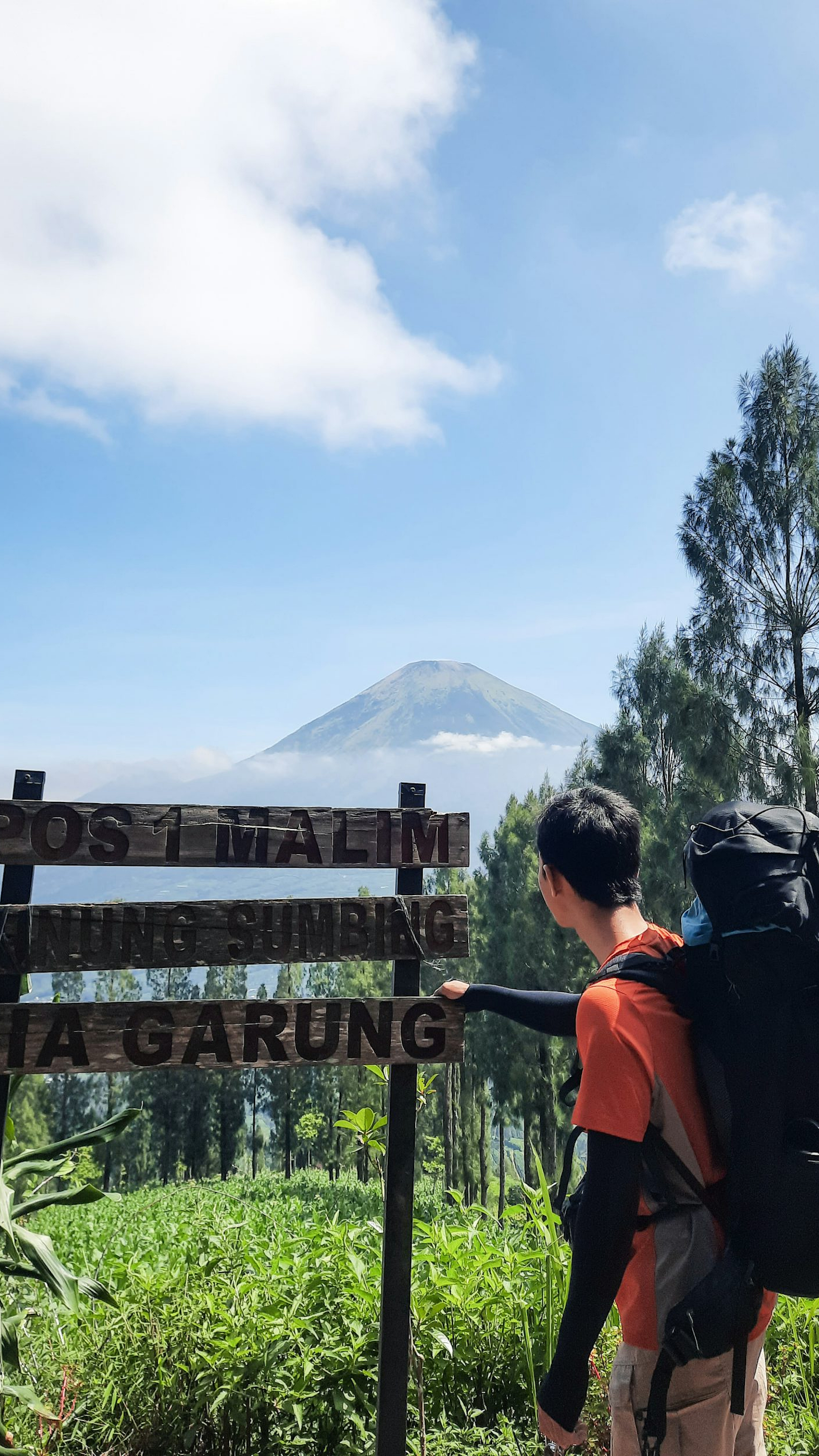 man, backpack, sign, traveler, hiking, journey, adventure, explorer, outdoor, nature, direction, guidance, path, wayfinding, destination