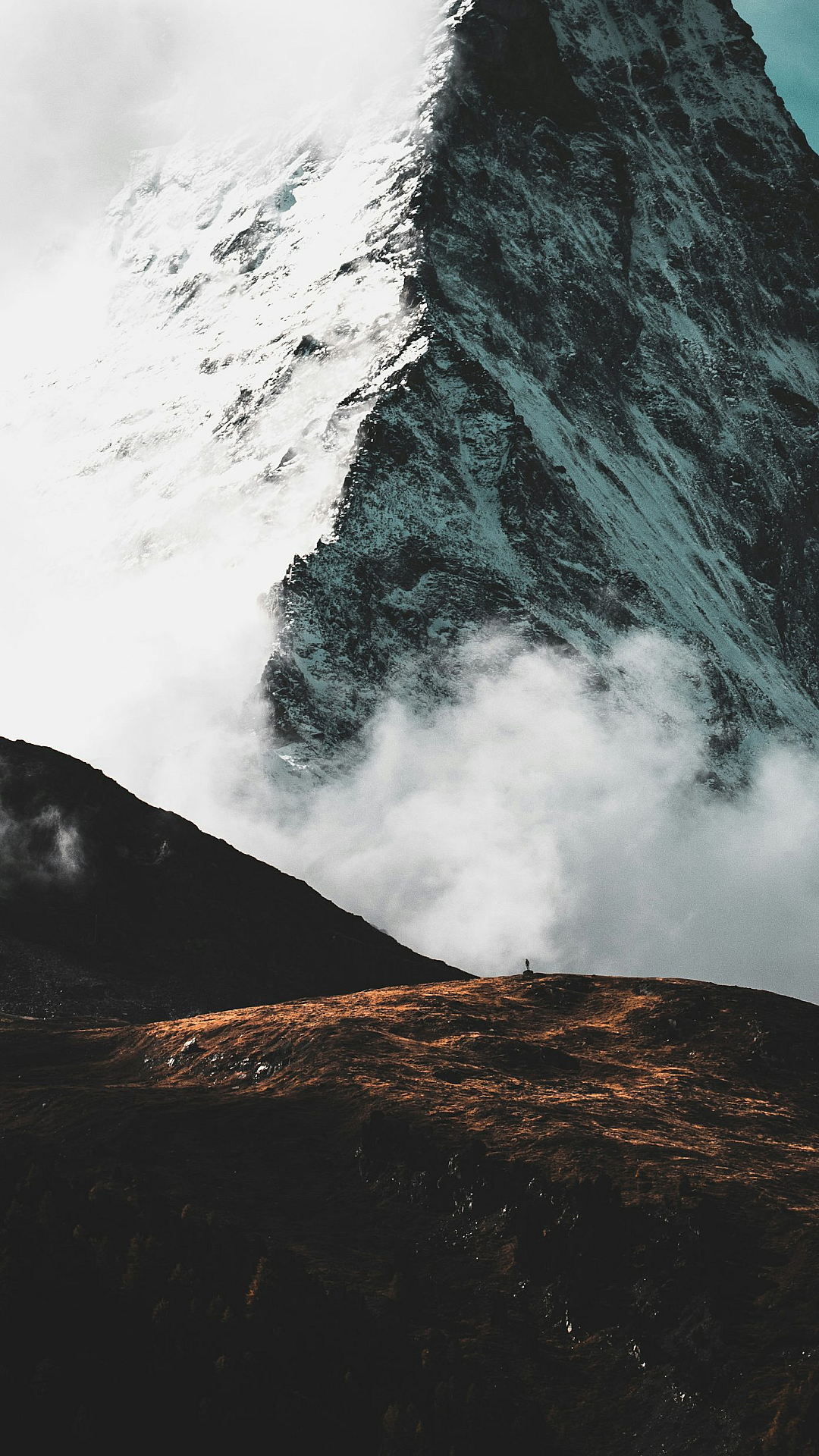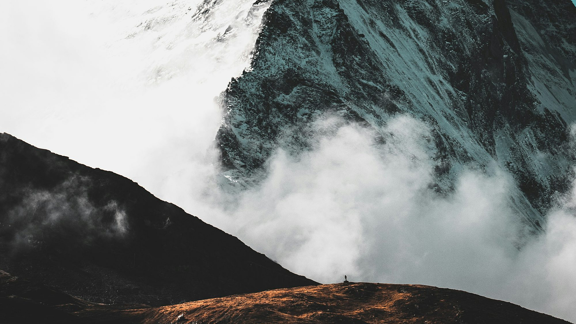 mountain, clouds, person, landscape, scenery, summit, peak, top, high altitude, nature, outdoor, adventure, exploration, solitude, view