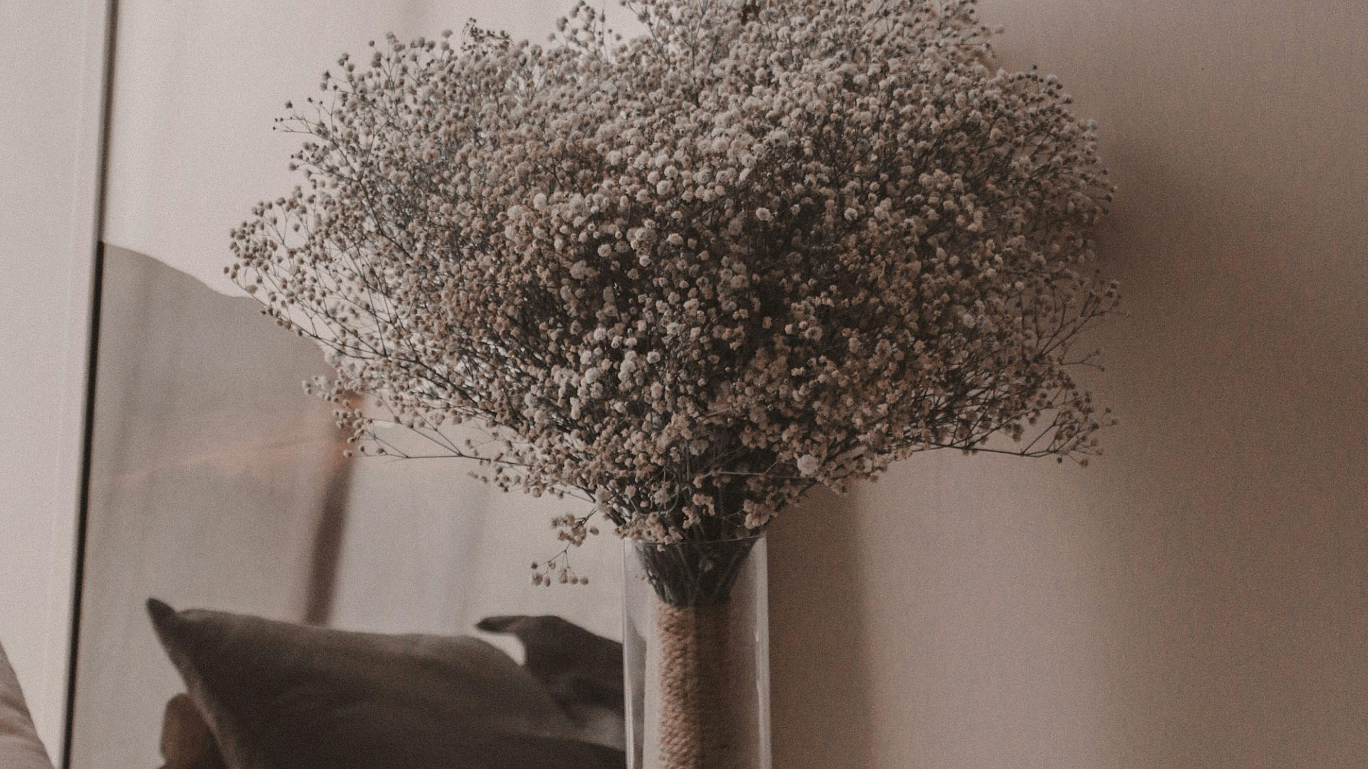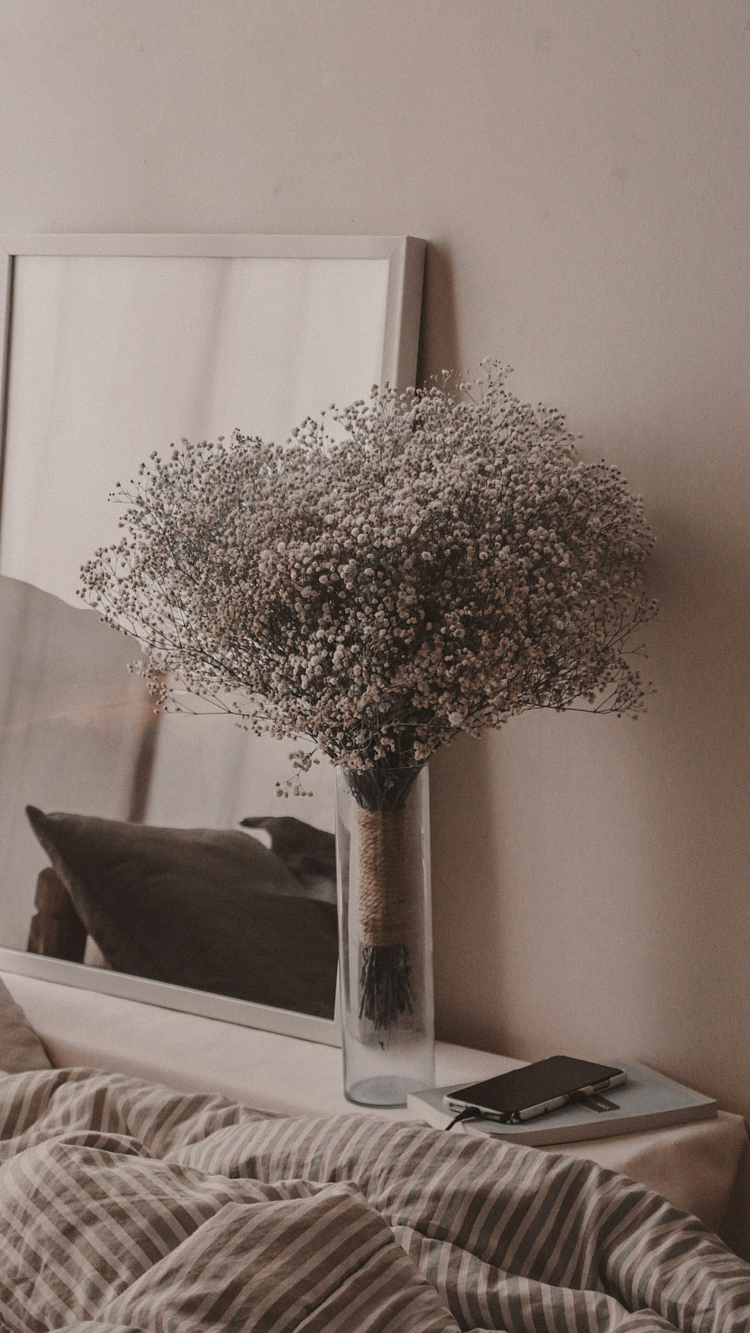 baby’s breath, gypsophila, flowers, vase, bed, bedroom, wallpaper, floral wallpaper, delicate flowers, white flowers, soft flowers, romantic wallpaper, bedroom decor, subtle wallpaper, elegant wallpaper