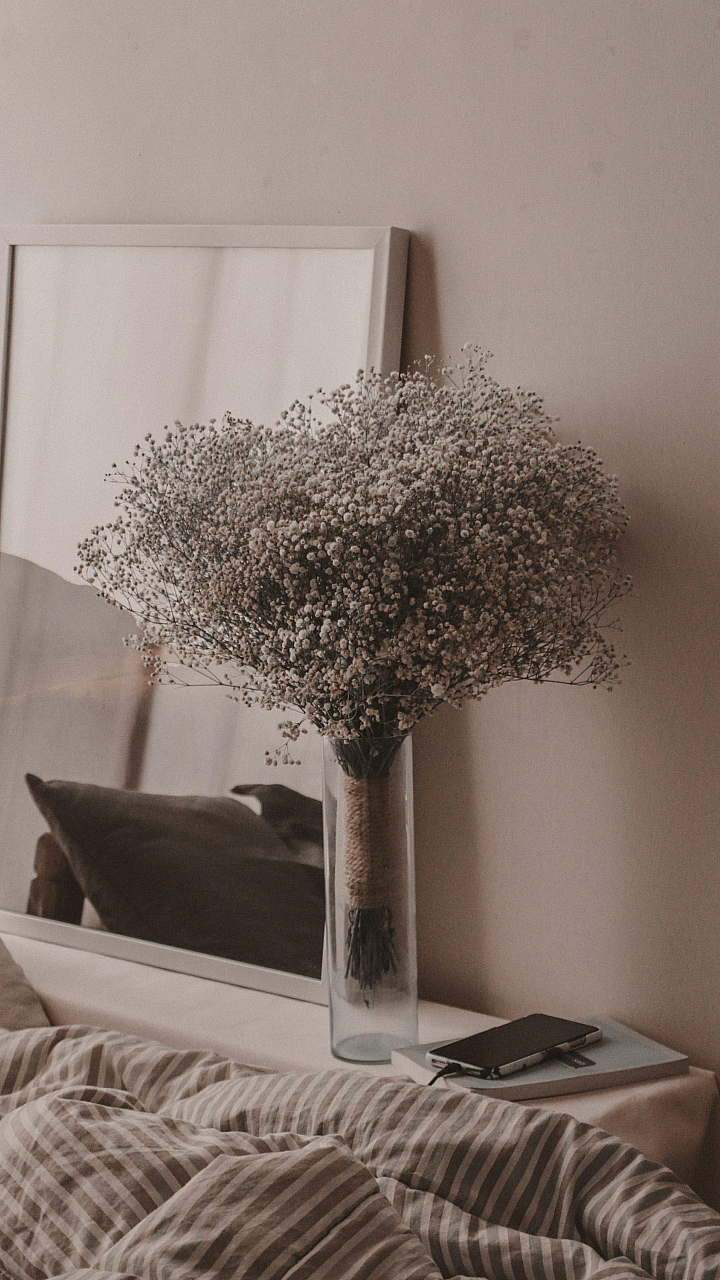 Wallpaper A Vase Filled with Baby’s Breath on a Bed
