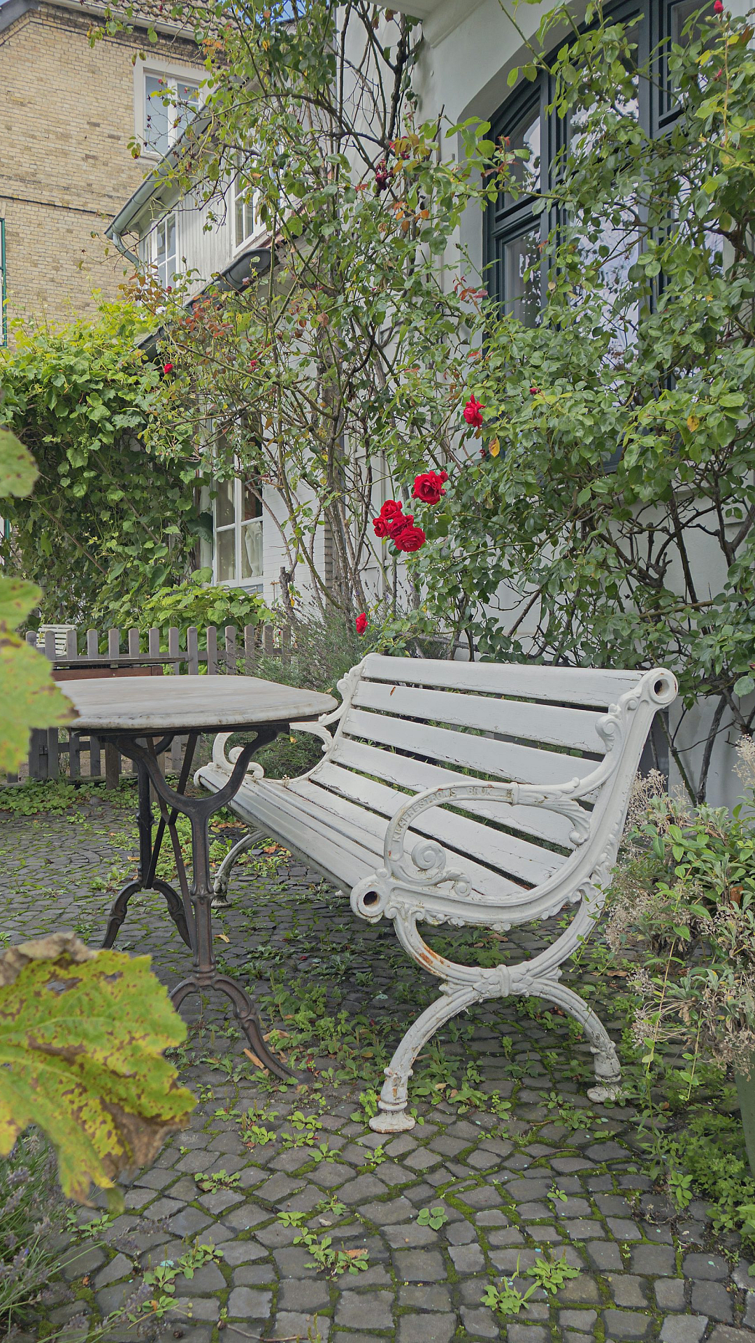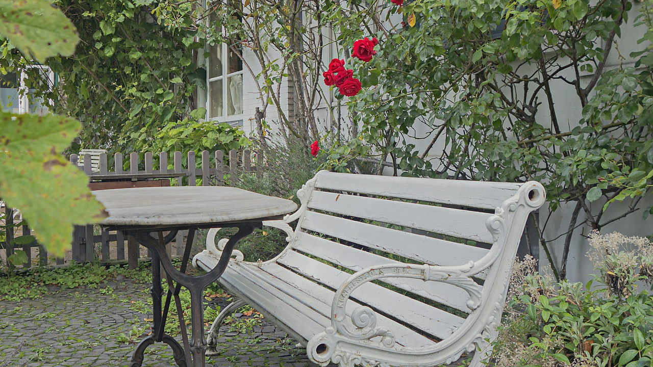 white bench, small table, minimalist, simple, serene, peaceful, outdoor, garden, patio, backyard, furniture, seating, rustic, cottagecore, white, bench, table, countryside, calm