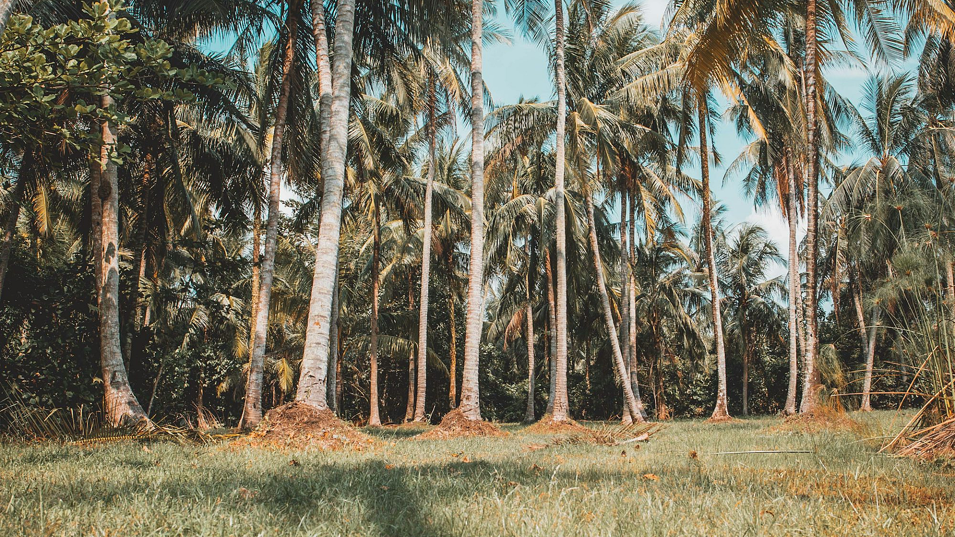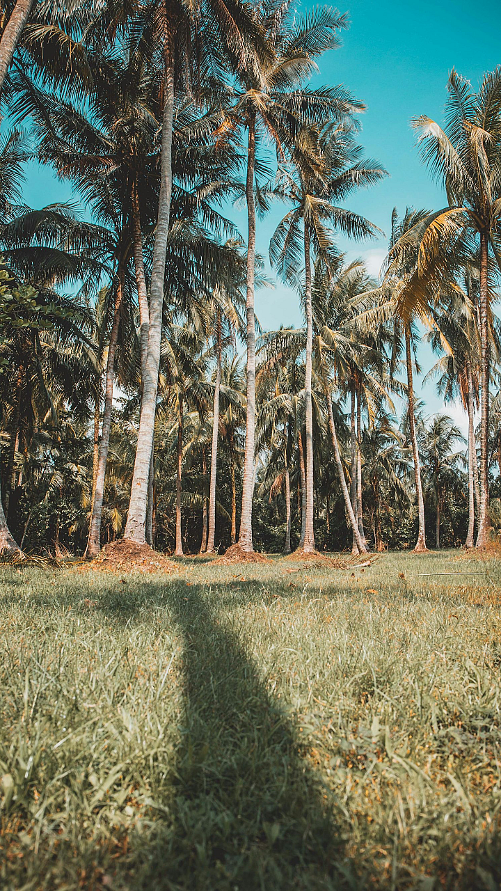 bird’s-eye view, aerial photography, coconut trees, palm trees, tropical, beach, ocean, island, sky, nature, landscape, vacation, paradise, summer, green
