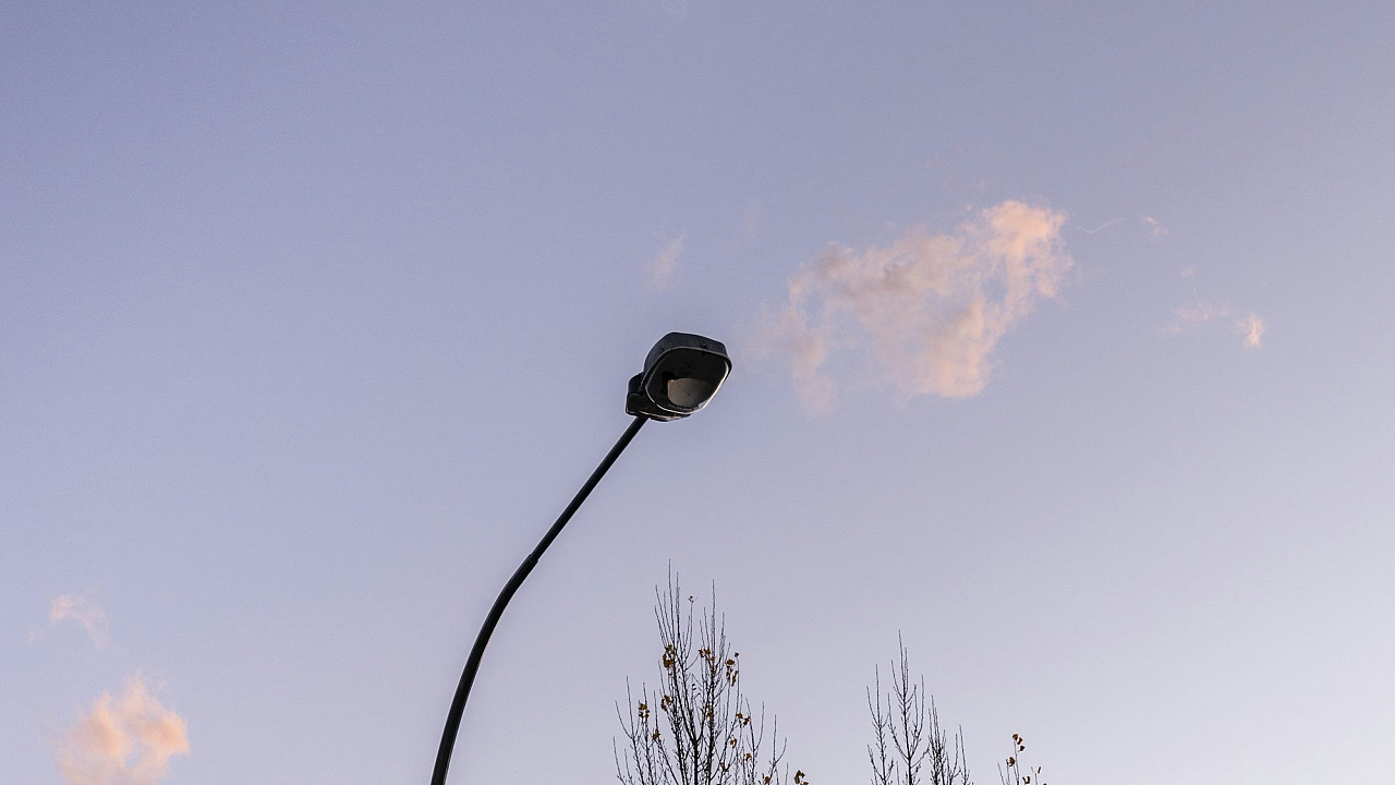 black street light, blue sky, daytime, street light, dark streetlight, bright sky, daylight, contrast, urban, city, street scene, atmospheric, shadow, silhouette, photography