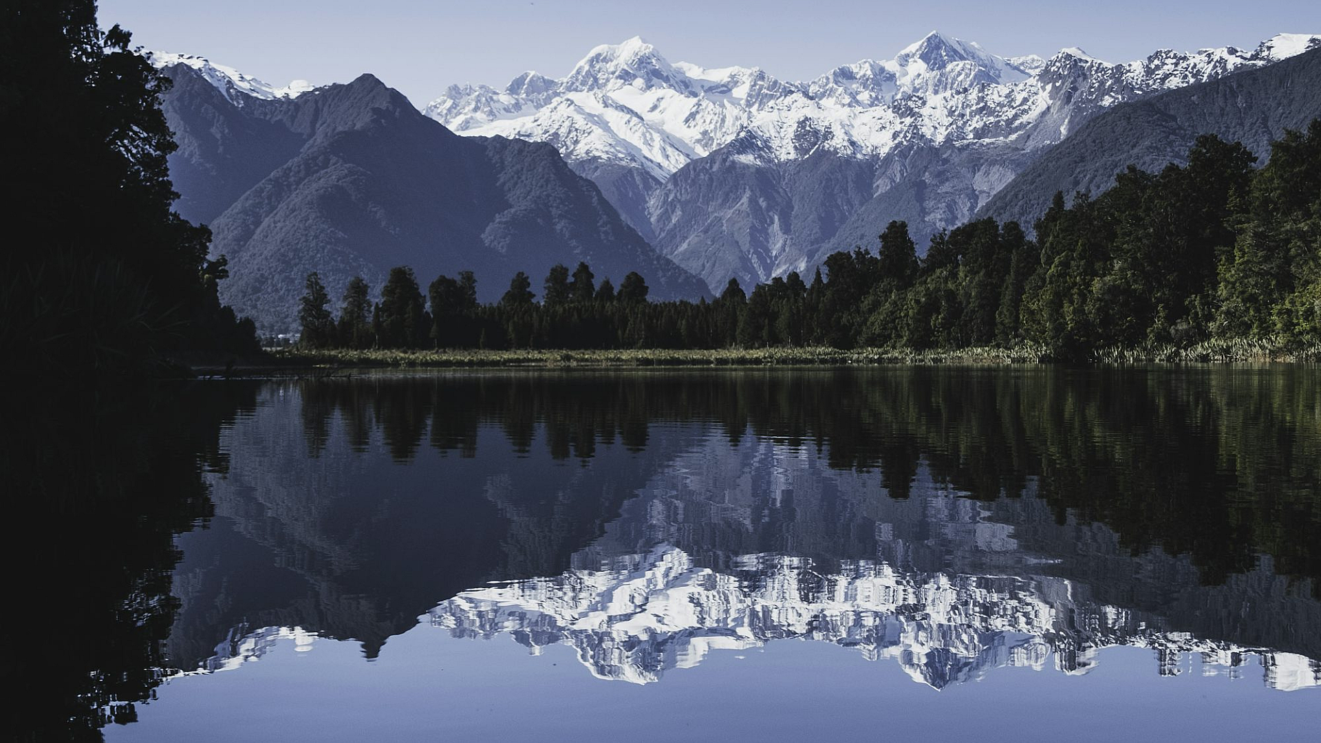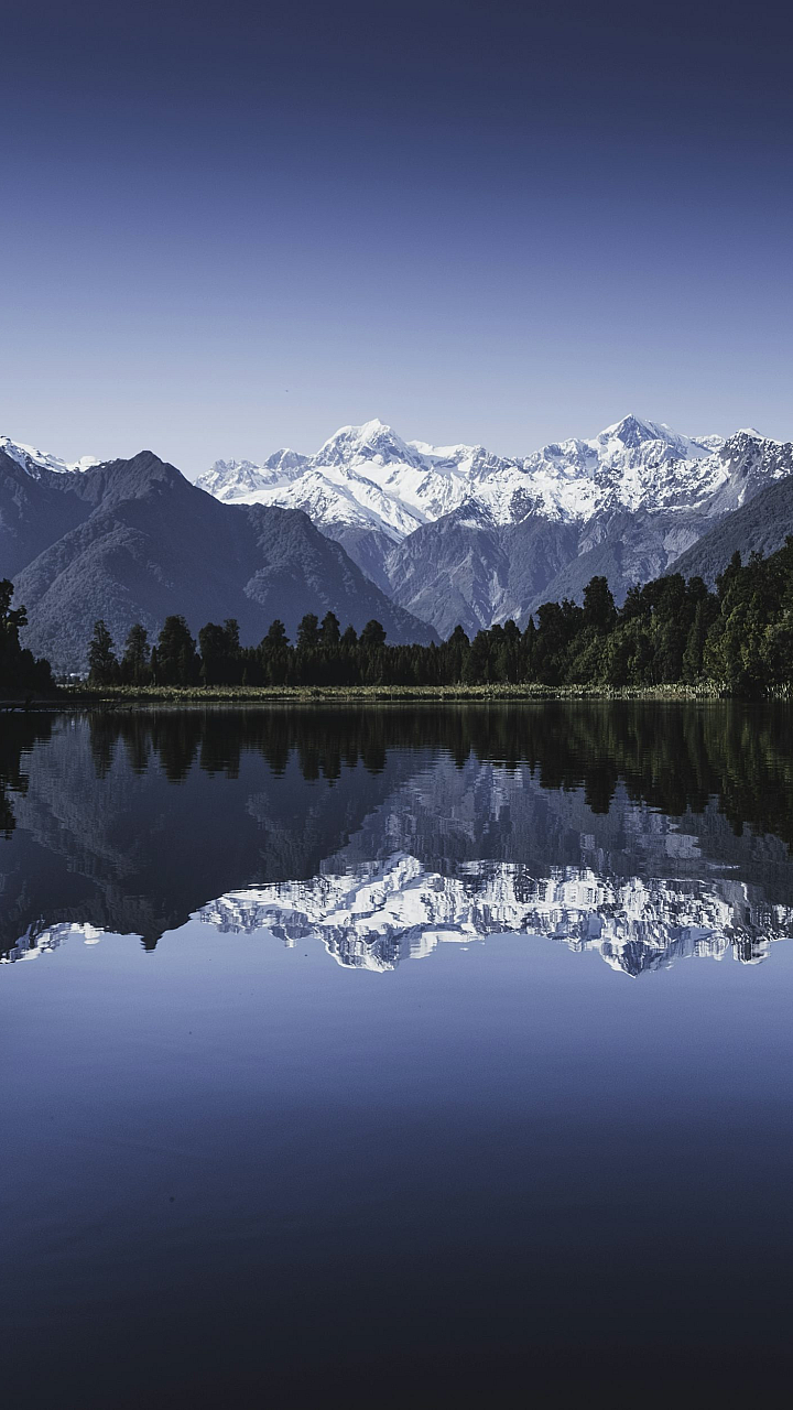 body of water, lake, river, pond, ocean, sea, water, green trees, forest, woods, trees, foliage, clear blue sky, sky, nature