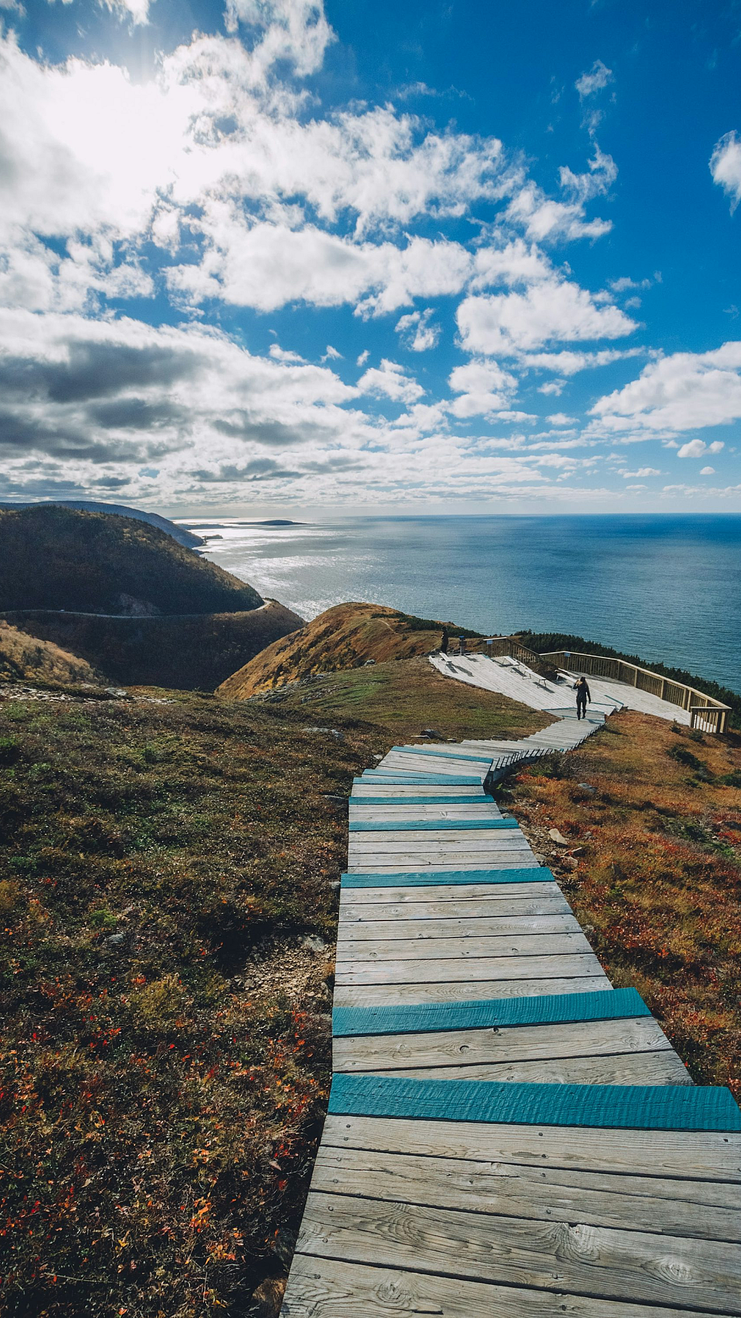 This stunning wallpaper features a captivating image of brown wooden stairs winding their way up a dramatic cliff overlooking a breathtaking sea. The scene is bathed in the warm light of daytime, creating a tranquil and inviting atmosphere. The coastal setting is beautifully captured, showcasing the raw beauty of nature and the impressive landscape.