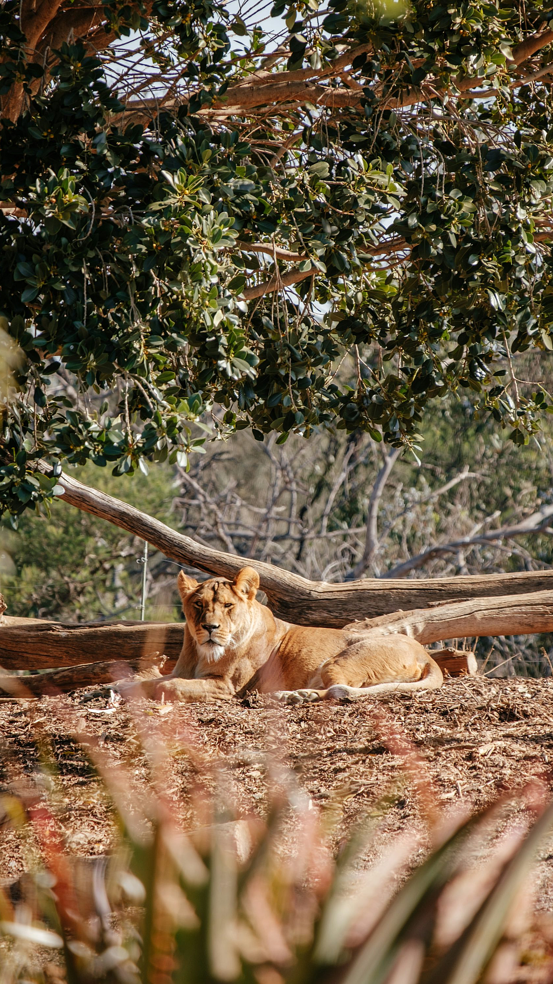 Wallpaper Brown Lioness Lying Near Tree Log