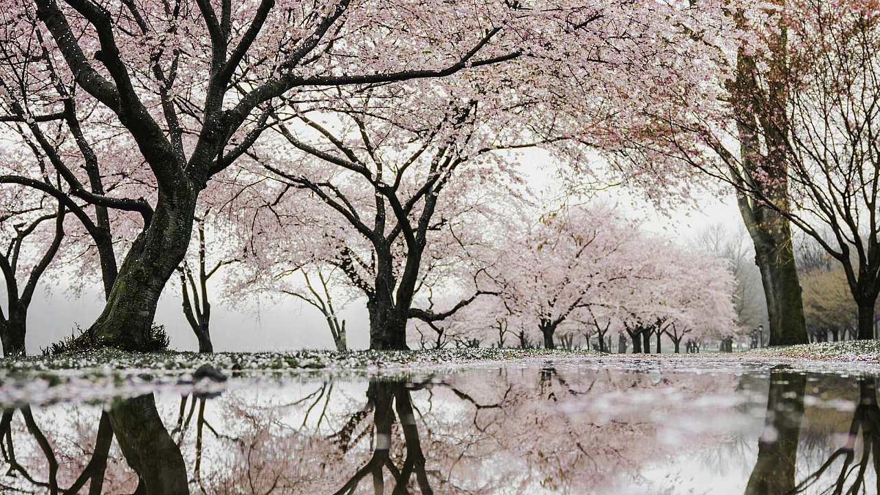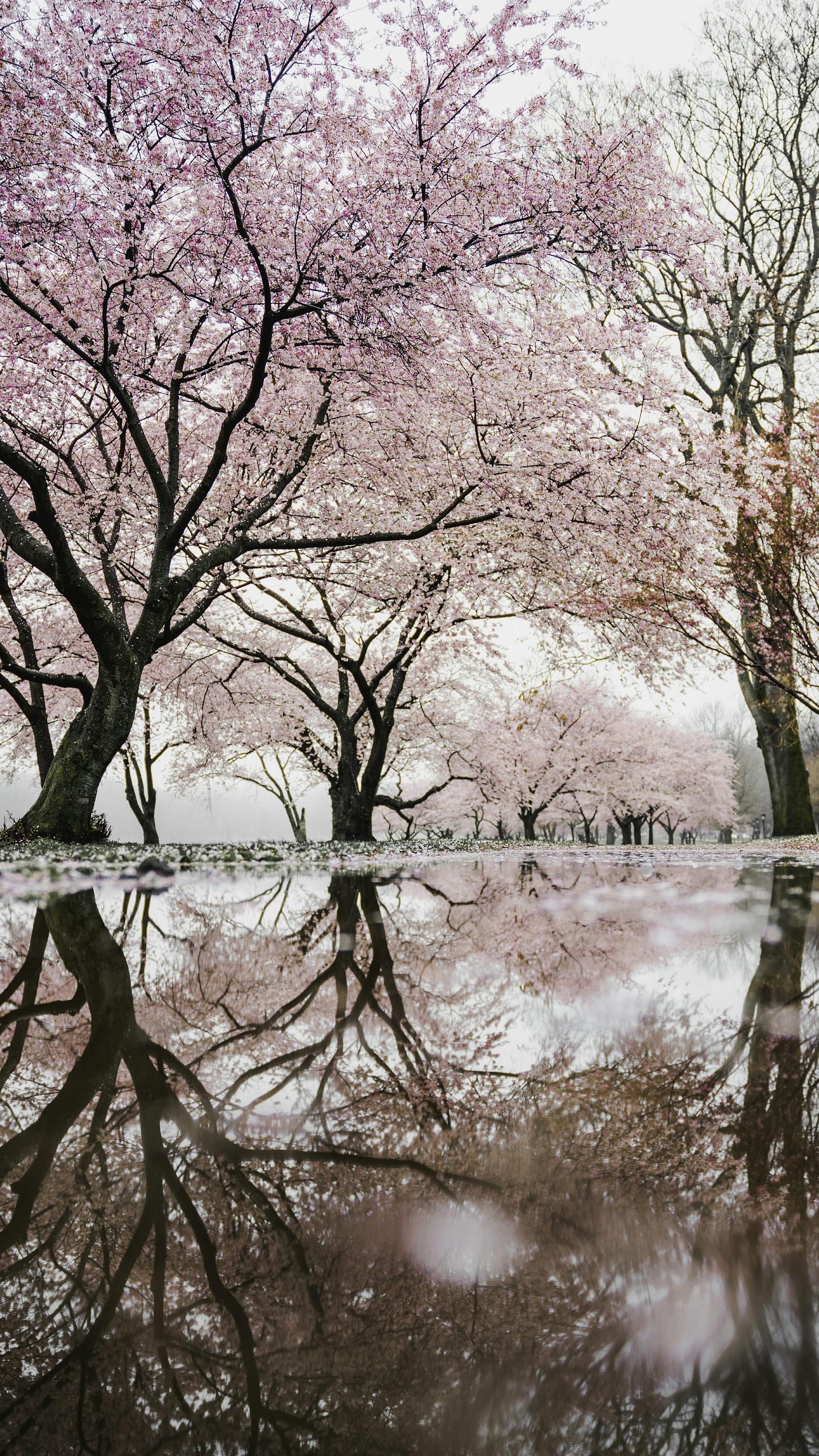 cherry blossom trees near river