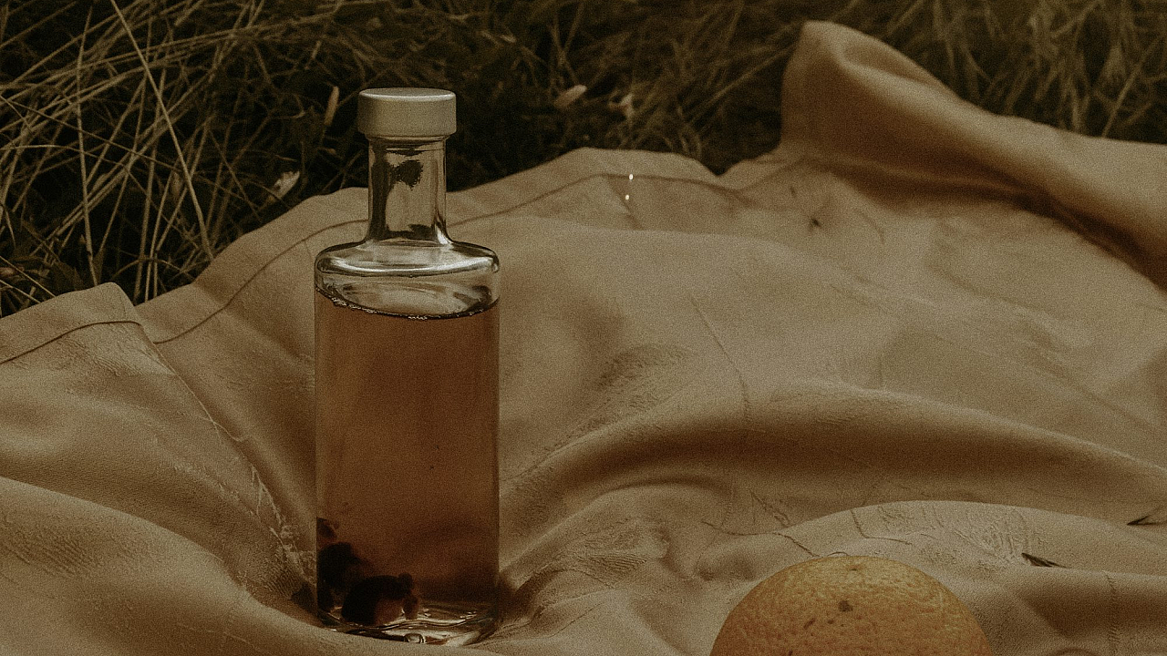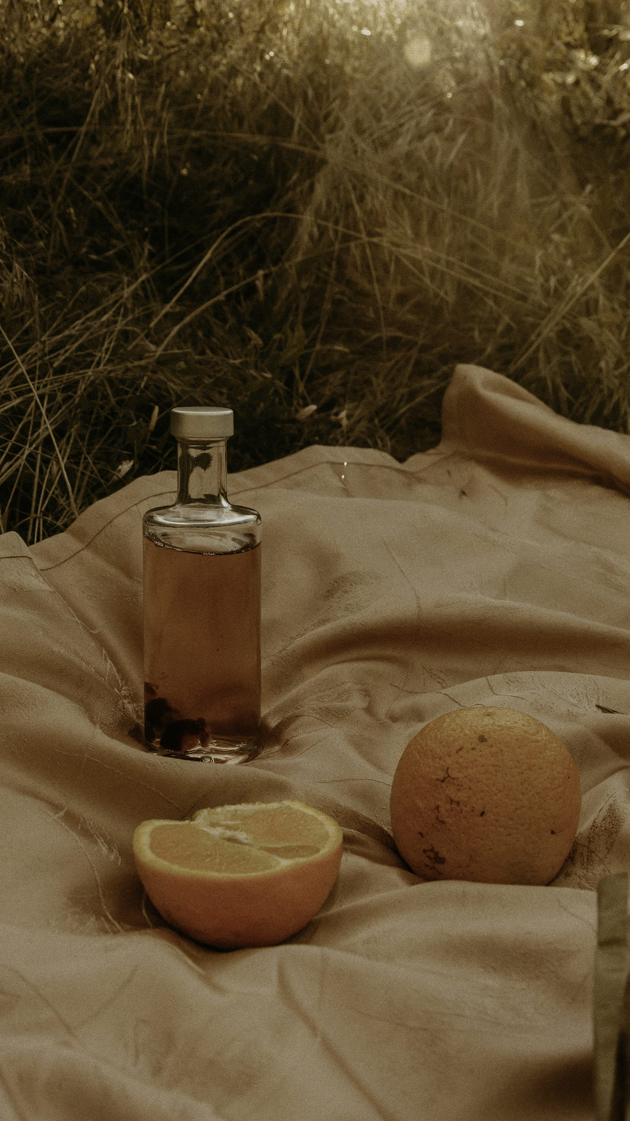 clear glass bottle on pink textile