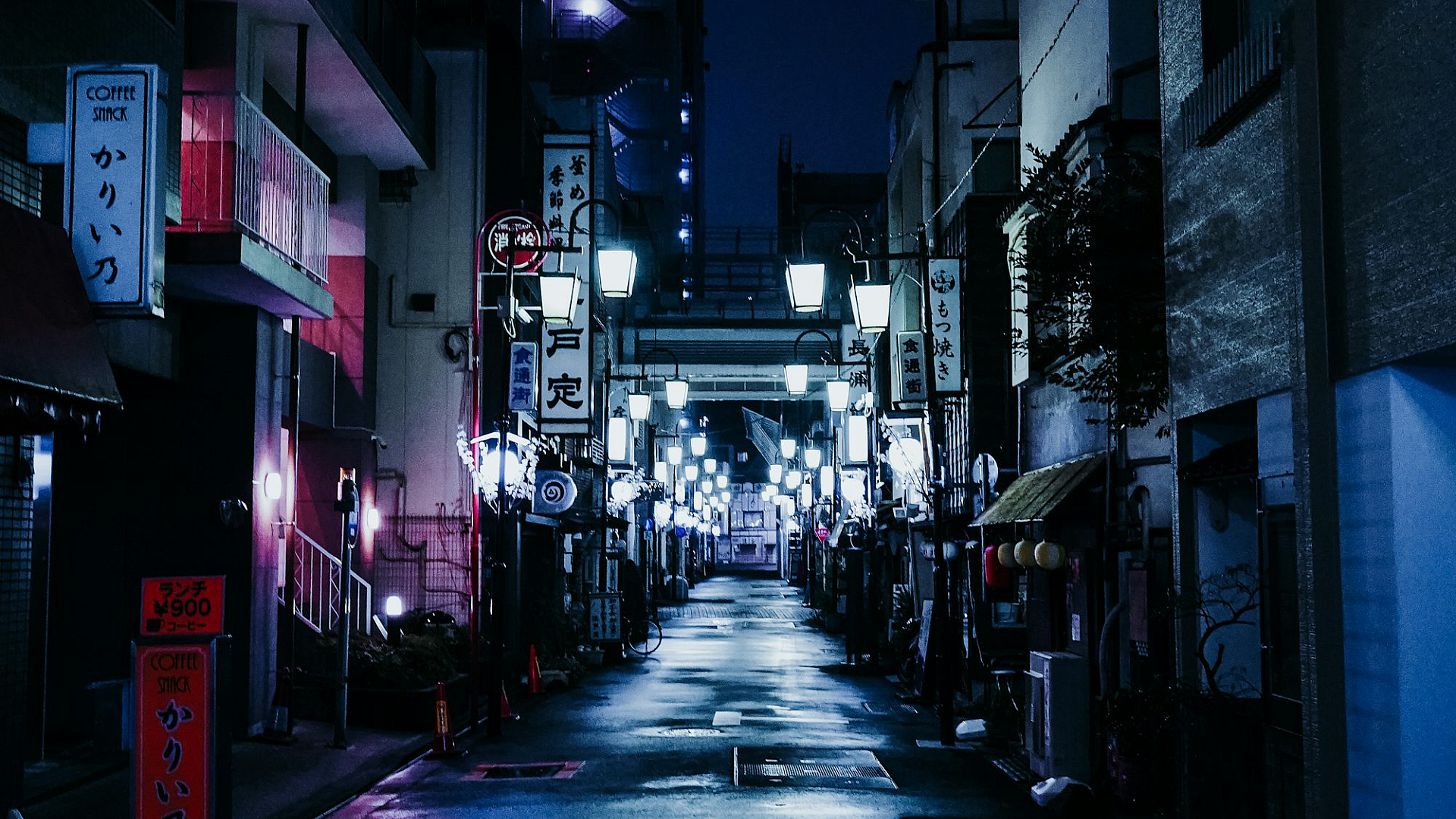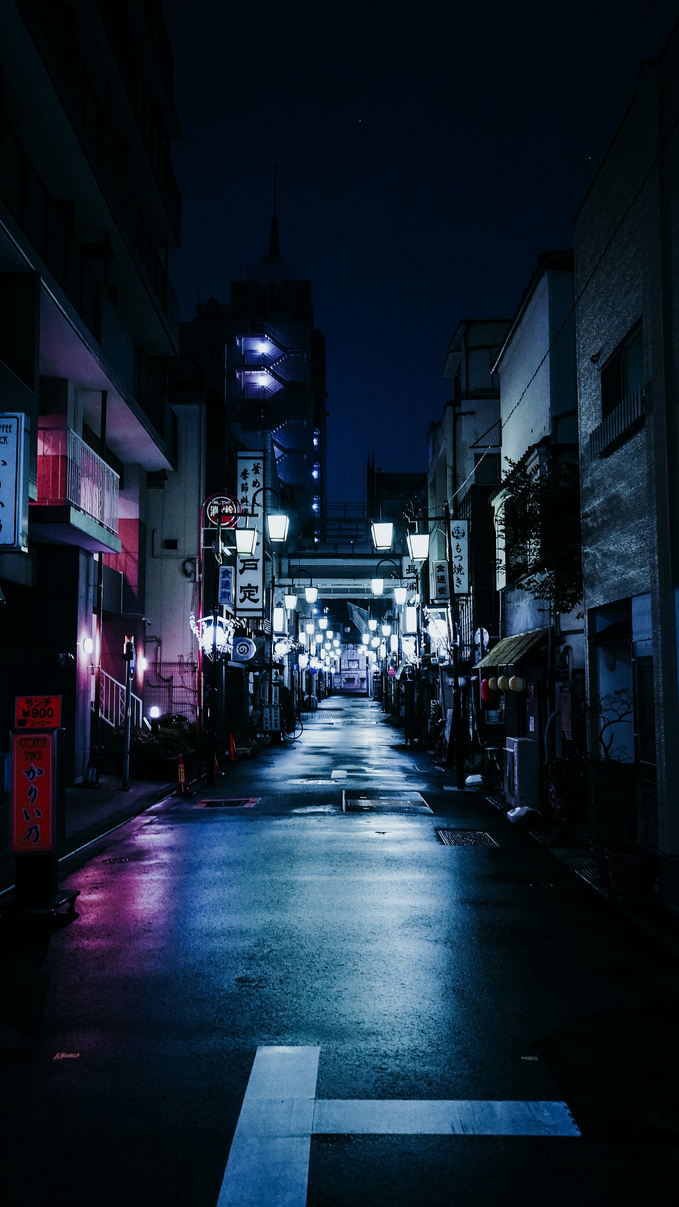 This wallpaper features a captivating image of an empty street at night, bathed in the warm glow of lighted lamps. The scene evokes a sense of serenity and mystery, ideal for those seeking a calming and atmospheric backdrop for their devices.