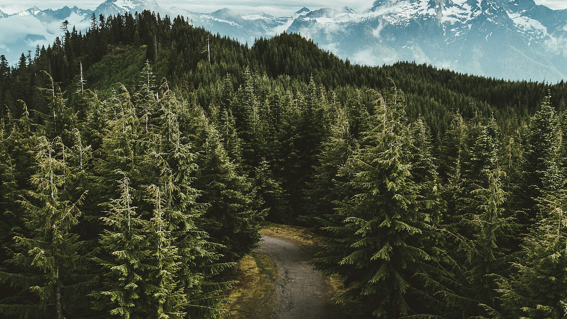 This stunning high-angle shot captures a gray asphalt road winding its way between lush, green leafed trees. The cloudy sky above casts a soft, diffused light, creating a serene and peaceful atmosphere. The image offers a perfect balance of natural elements, making it ideal for a desktop or mobile wallpaper.