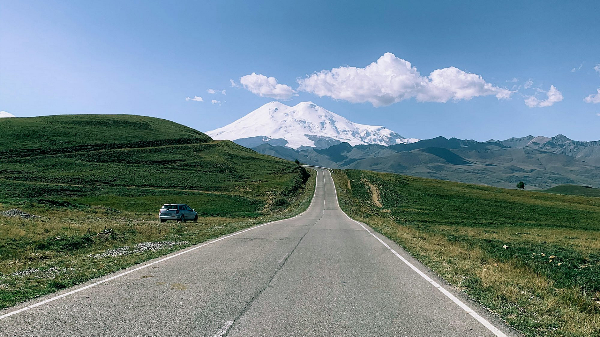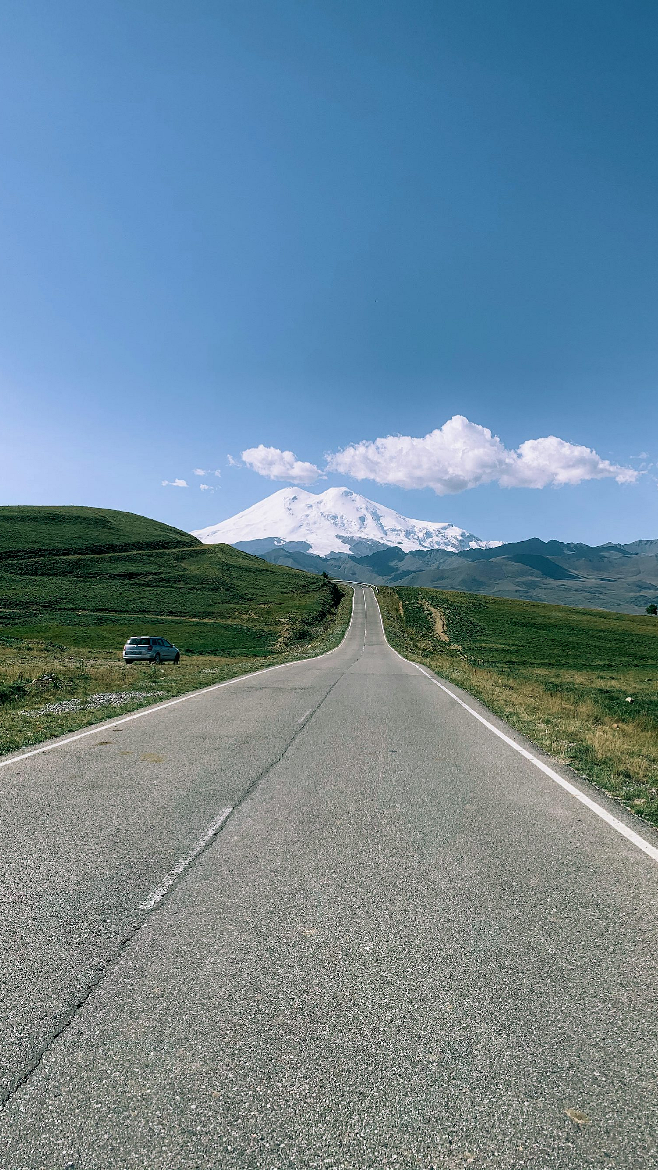 Keywords: gray concrete road, green grass field, blue sky, daytime, landscape, nature, scenery, pathway, road, asphalt, concrete, rural, countryside, outdoor, summer