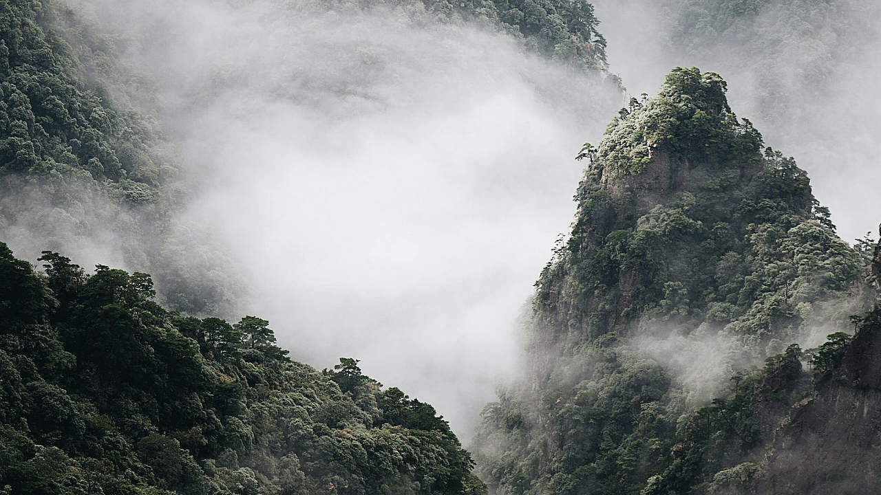 This stunning wallpaper showcases a lush green tree lot completely enveloped by a blanket of fluffy white clouds. The scene evokes a sense of serenity and tranquility, perfect for a desktop or mobile background.