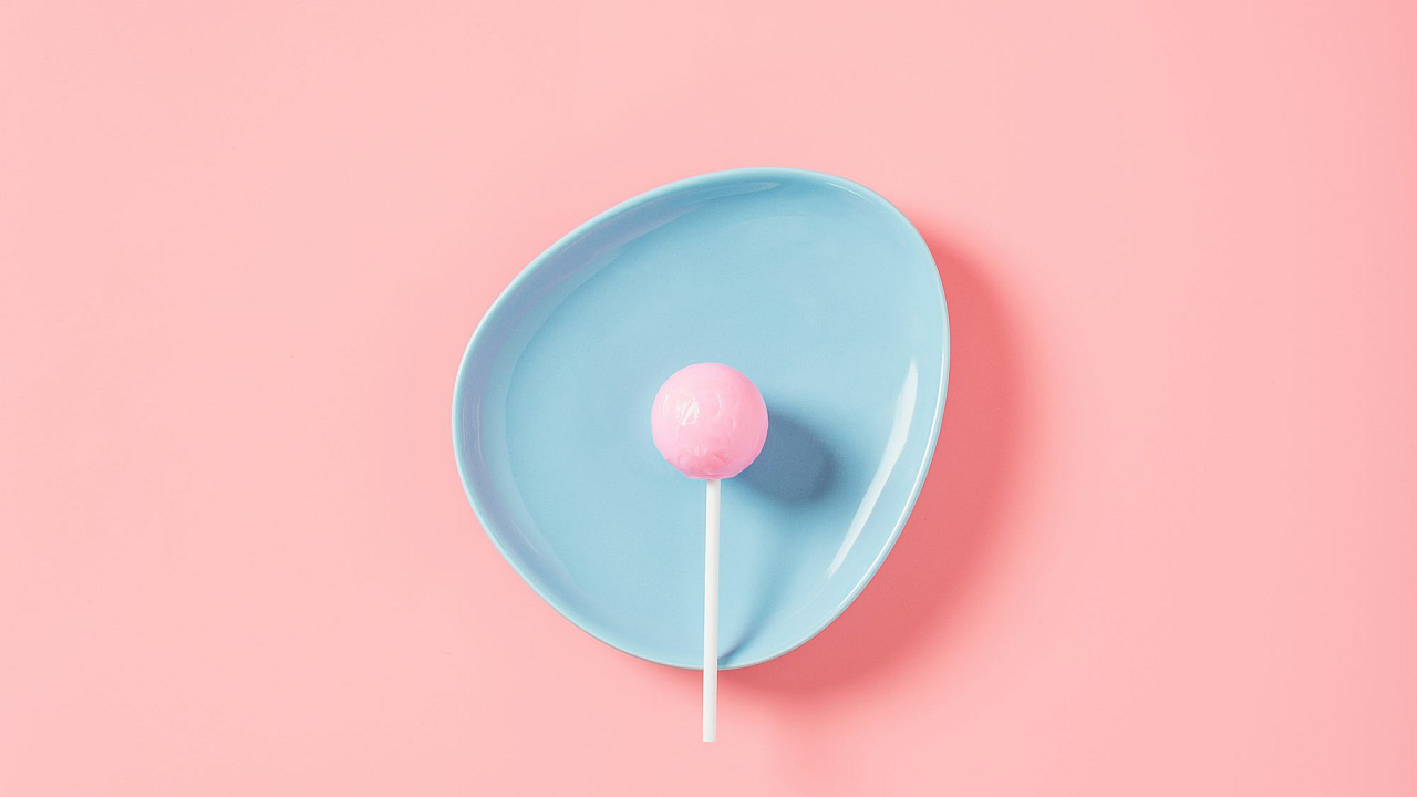 The focus on the single lollipop and blue plate creates a sense of calm and simplicity. The image is perfect for those seeking a visually appealing yet understated background. The overall mood is cheerful and slightly nostalgic, evoking memories of childhood treats and simple pleasures.