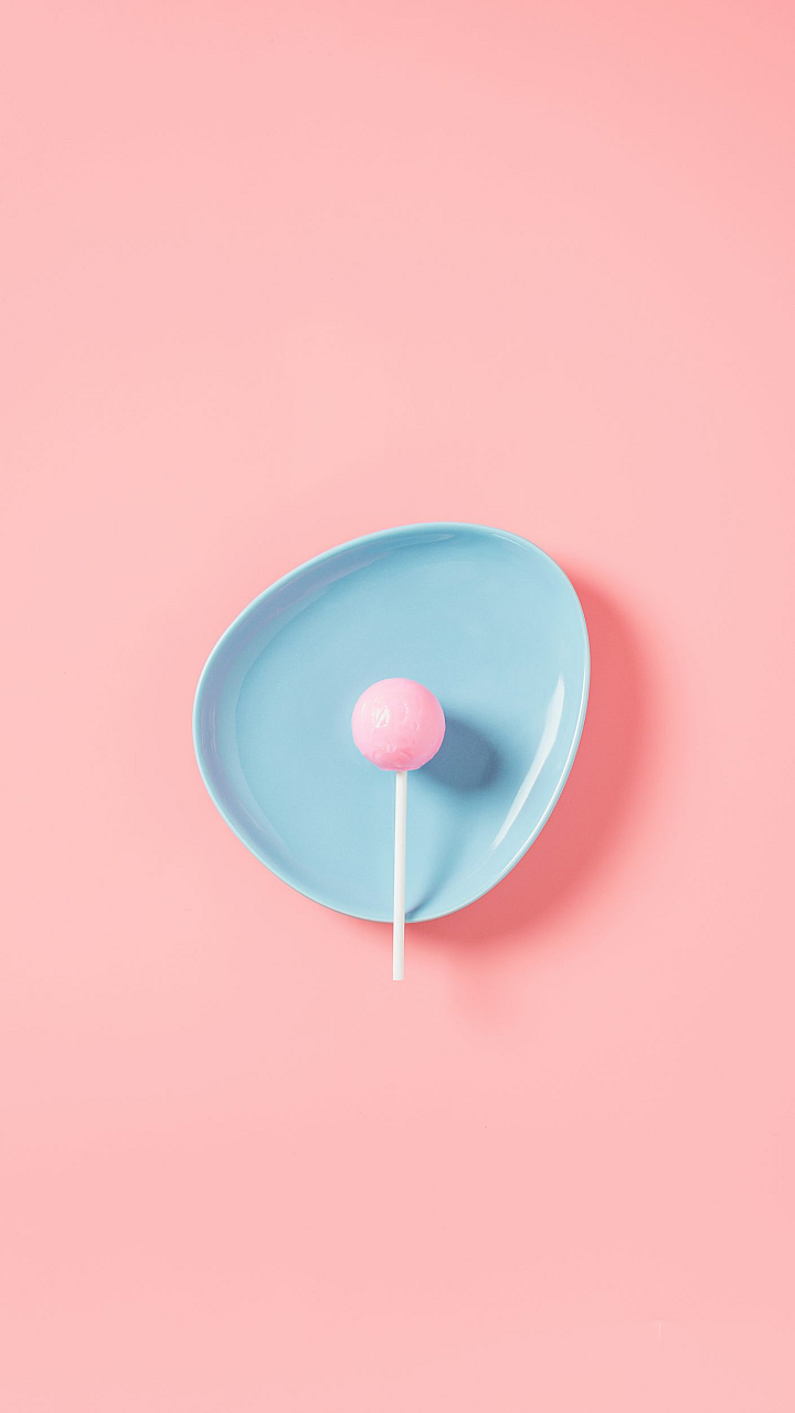 This wallpaper is ideal for those who appreciate clean designs and vibrant colors. The contrast between the bright lollipop and the soothing blue plate creates a visually striking image that is both eye-catching and calming. The minimalist composition ensures that the image is not overwhelming, making it perfect for a variety of uses.