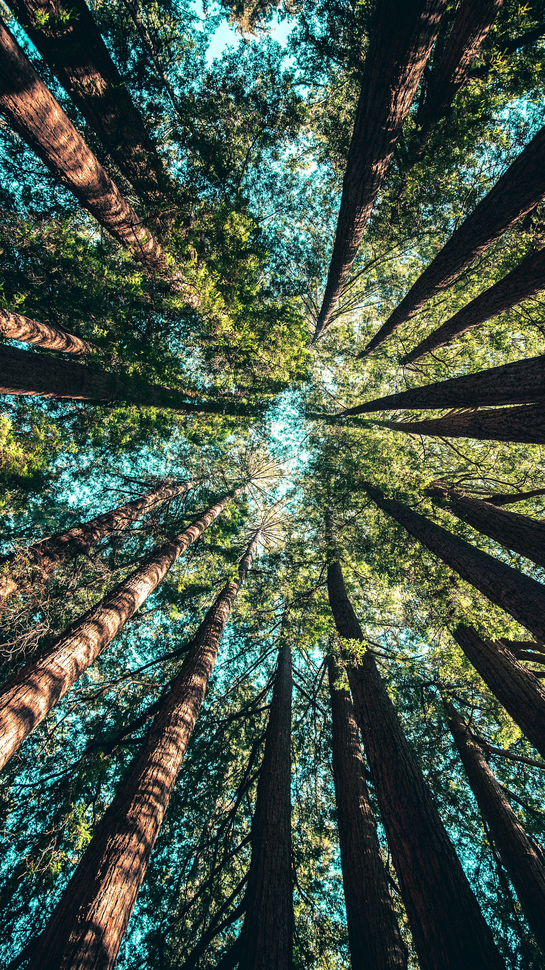 low angle photography, trees, daytime, nature, landscape, forest, woods, foliage, sunlight, upward view, perspective, canopy, branches, vertical shot, outdoor