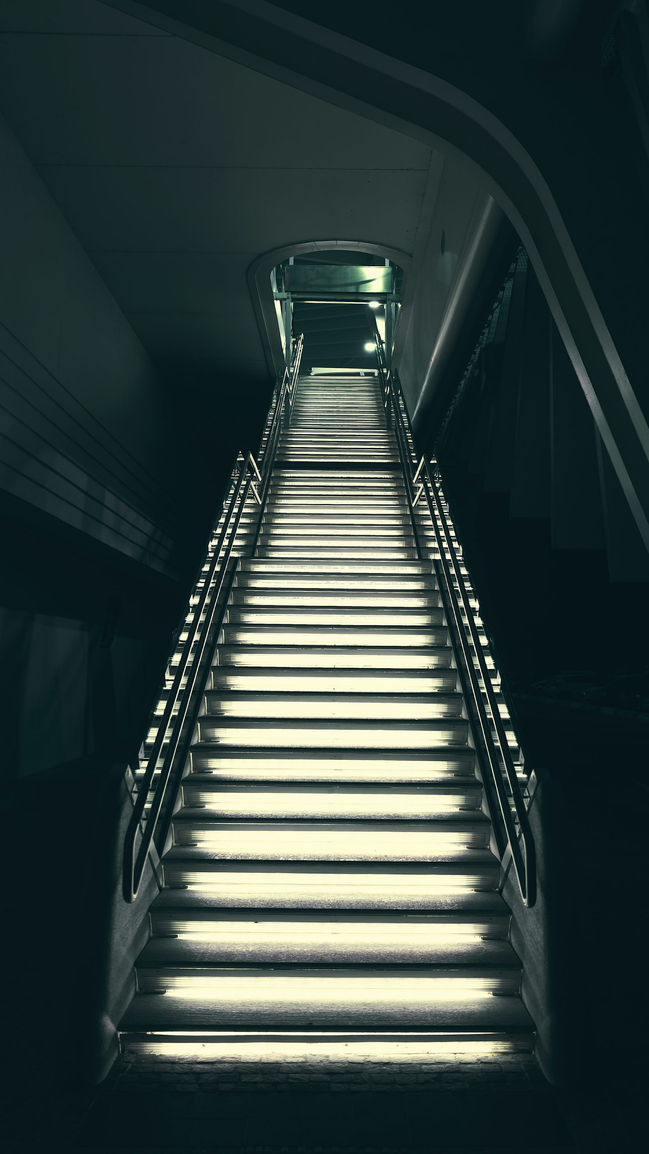 The perspective of the low angle shot draws the viewer’s eye upwards, creating a sense of height and depth. The geometric pattern of the steps adds a subtle element of order and structure to the composition. The image is perfect for those seeking a minimalist or modern wallpaper design.