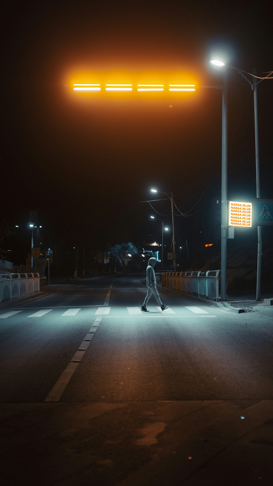 This wallpaper features a man wearing a black jacket and blue denim jeans. He is walking along a sidewalk at night. The overall mood is dark and solitary, creating a sense of mystery and intrigue. The image is perfect for those who appreciate urban photography and moody atmospheres. The lone figure against the nighttime city backdrop offers a striking visual.