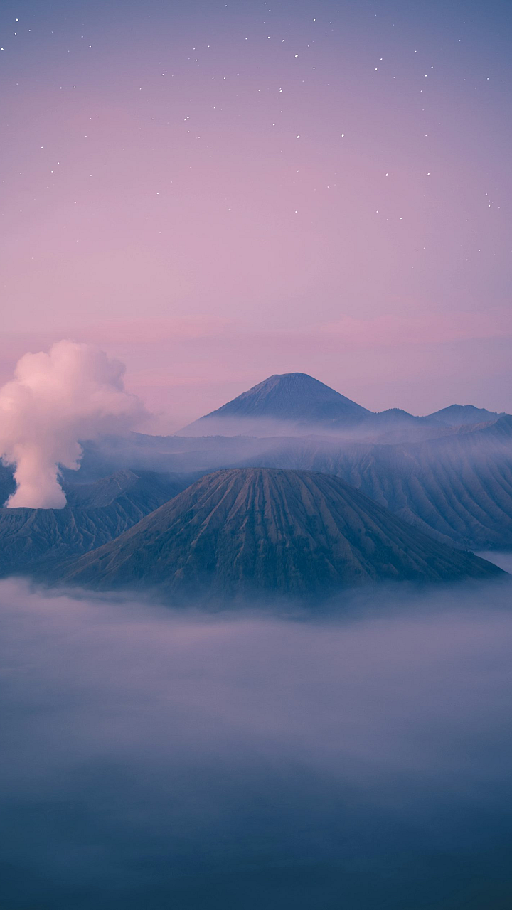 This stunning wallpaper features a majestic mountain shrouded in a sea of clouds. The scene evokes a sense of serenity and awe, perfect for those seeking a calming and inspiring backdrop for their devices. The ethereal beauty of the clouds swirling around the mountain peak creates a captivating visual experience.