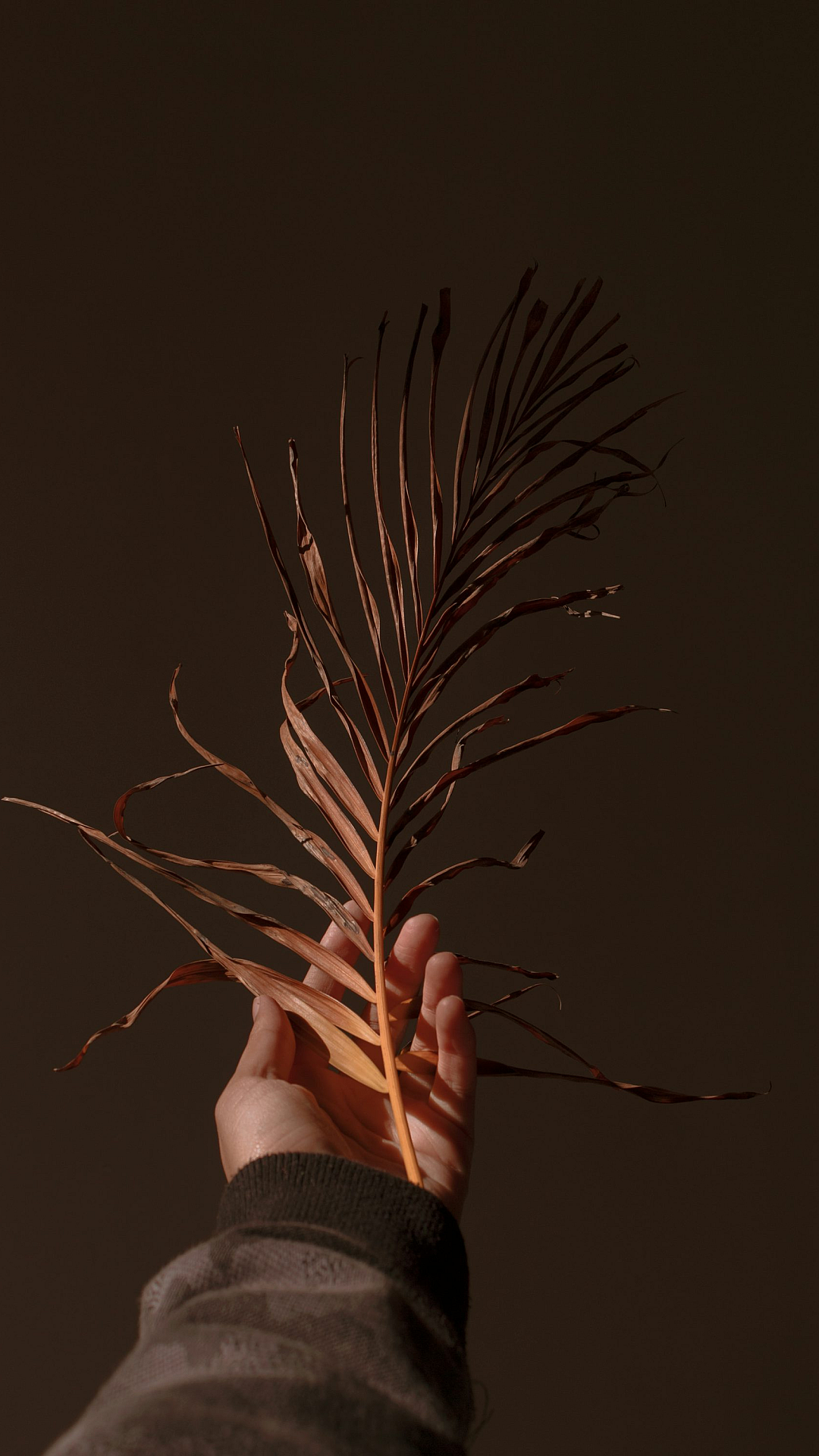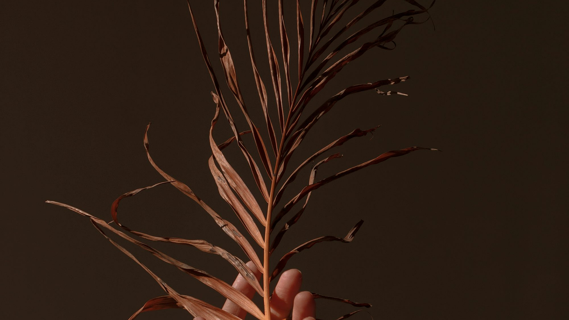 This wallpaper features a person gently holding a brown plant against a stark black background. The image evokes a sense of minimalism and nature. The dark backdrop allows the brown hues of the plant to stand out, creating a visually striking contrast.