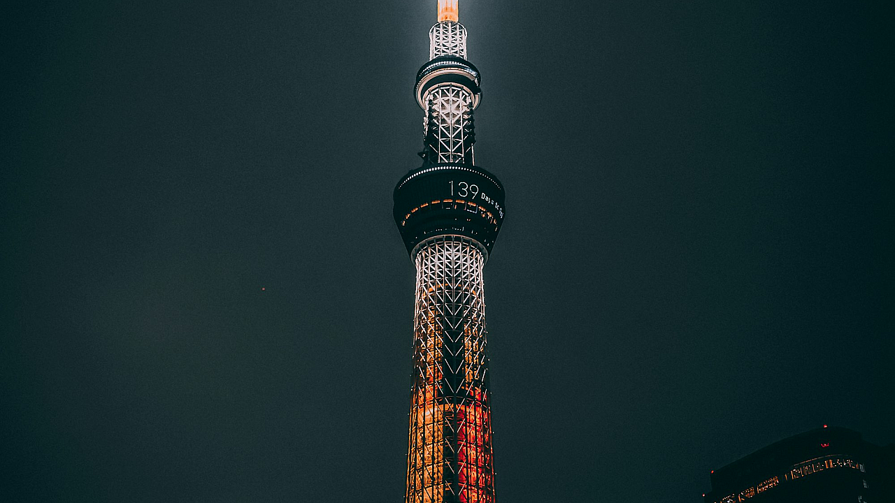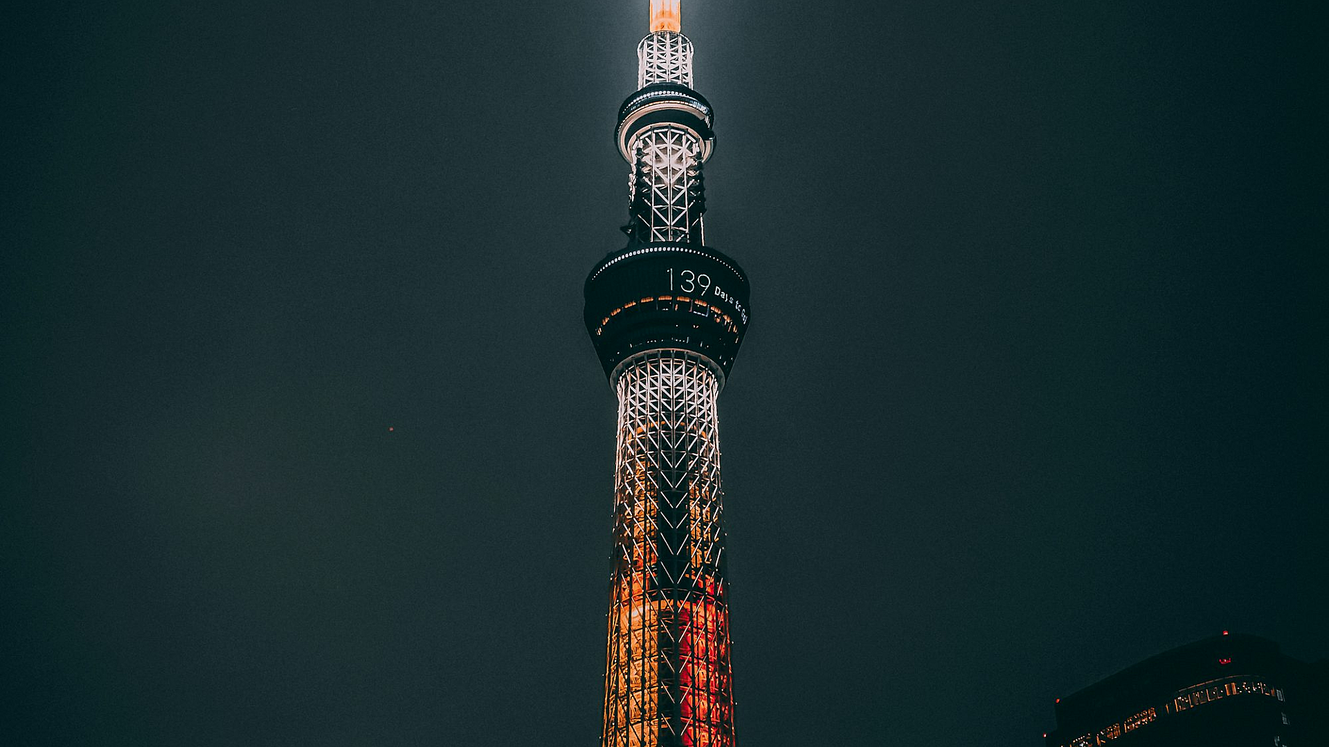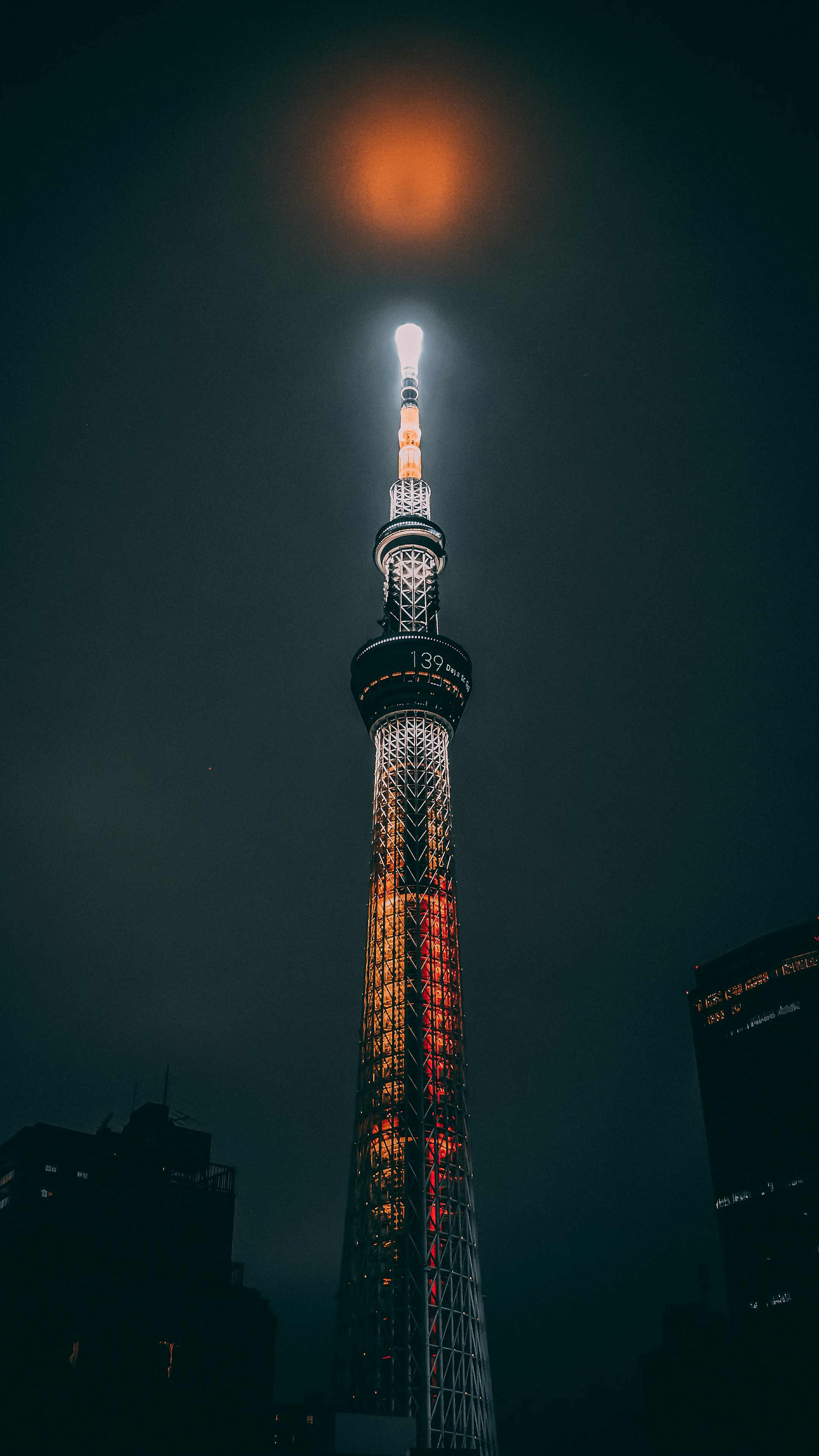 red tower, white tower, night, night scene, tower, building, structure, architecture, red and white, dark, evening, illuminated, cityscape, urban, skyscraper