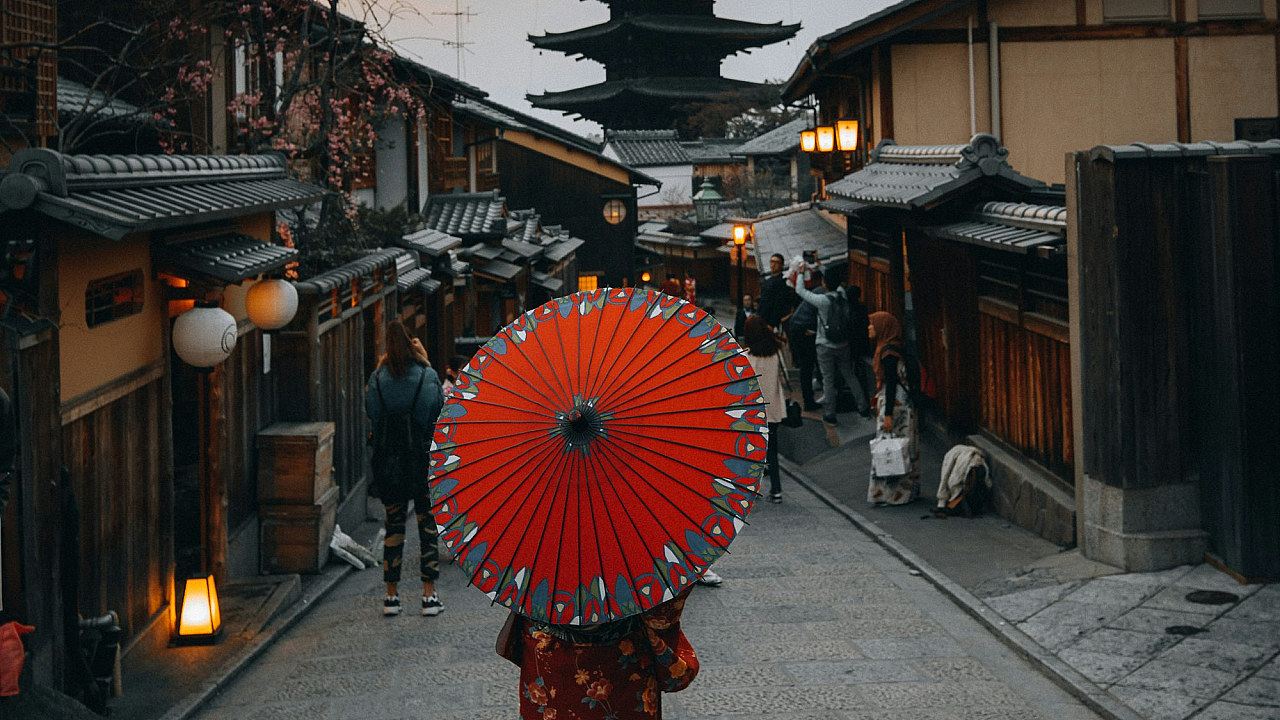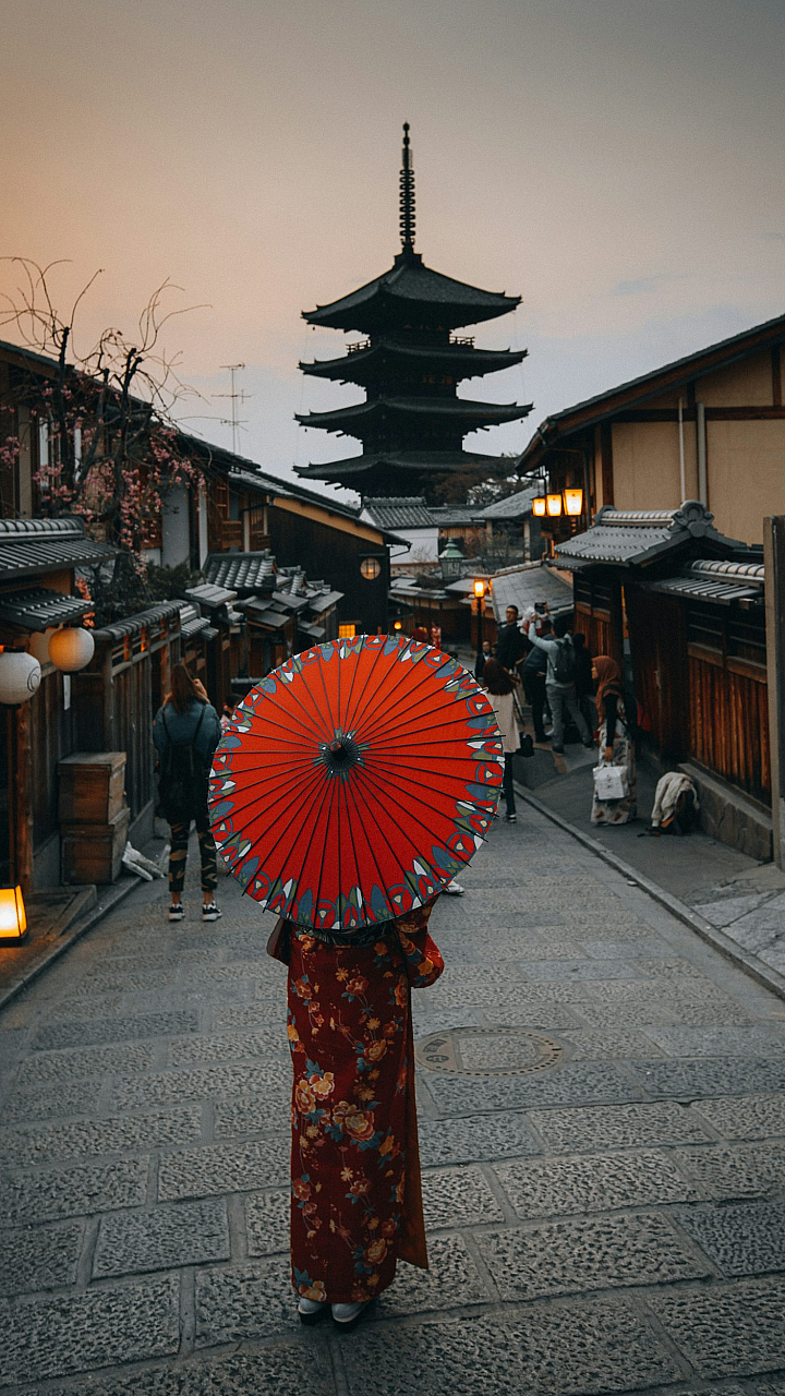 Wallpaper Red Umbrella on Black and White Street Lamp