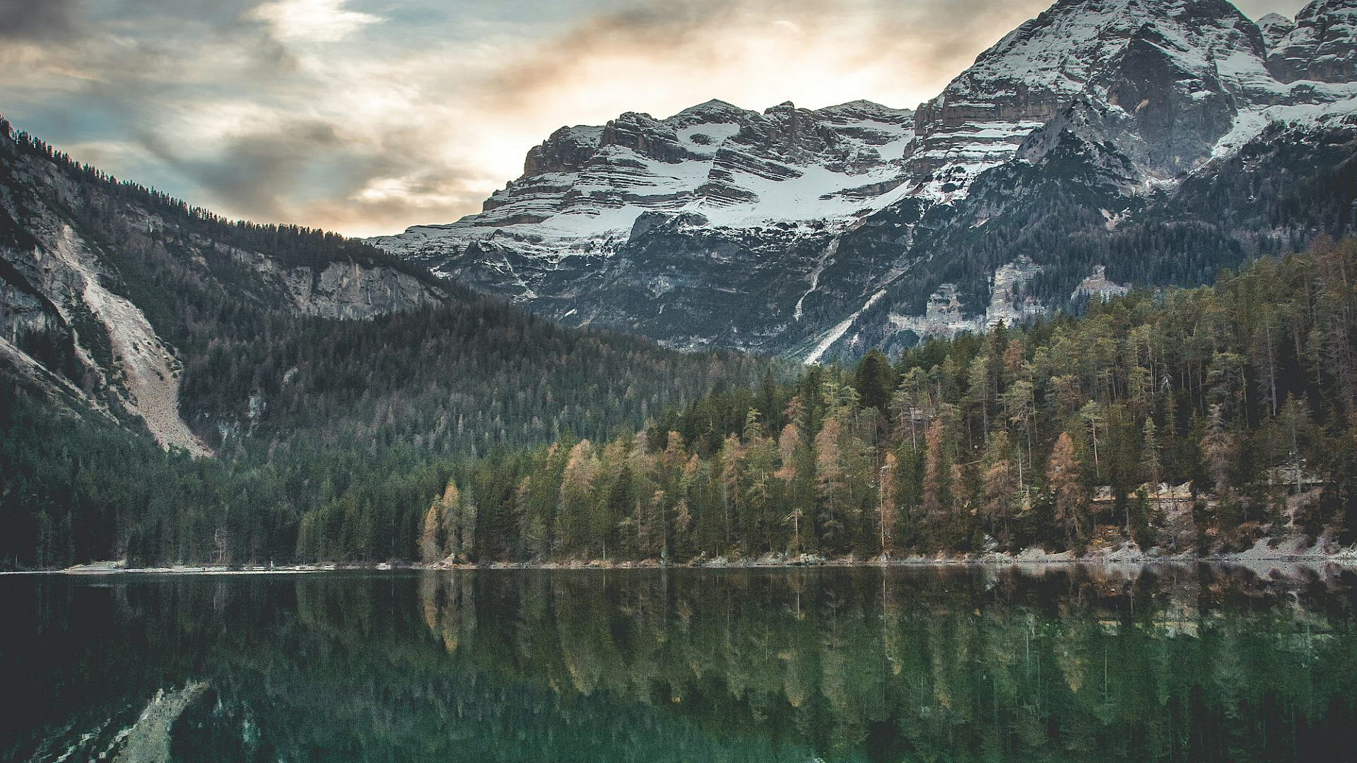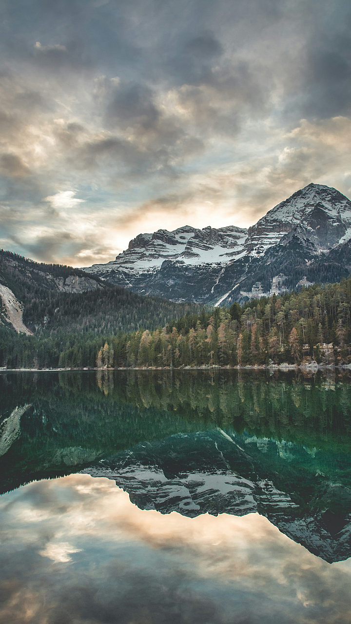 This wallpaper showcases a breathtaking scenery of majestic mountains adorned with lush trees. The image captures the serene beauty of nature, perfect for those seeking a peaceful and inspiring backdrop for their devices.