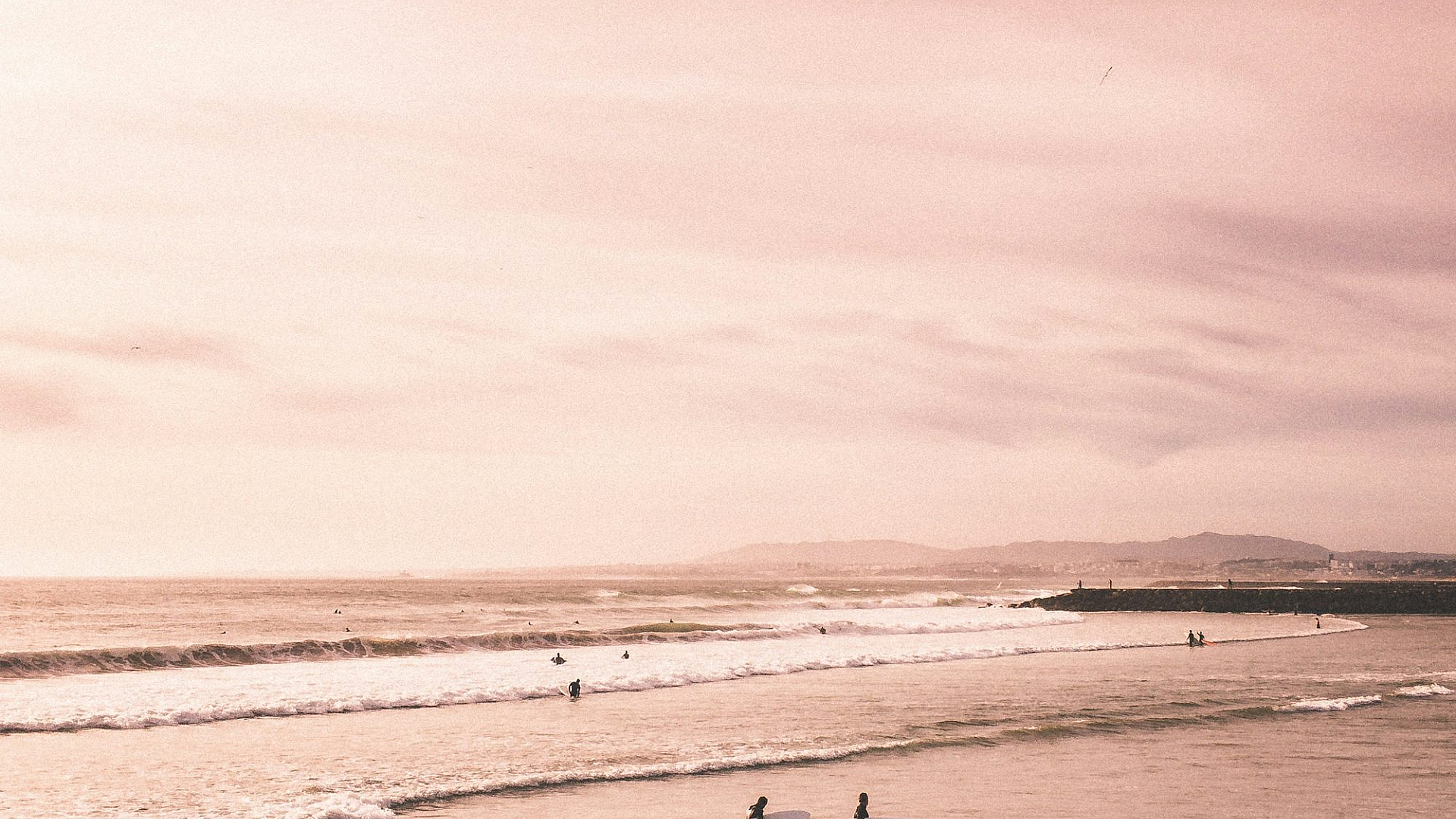 seashore, beach, coast, ocean, sea, people, individuals, group, standing, figures, landscape, waterscape, outdoor, nature, sunset