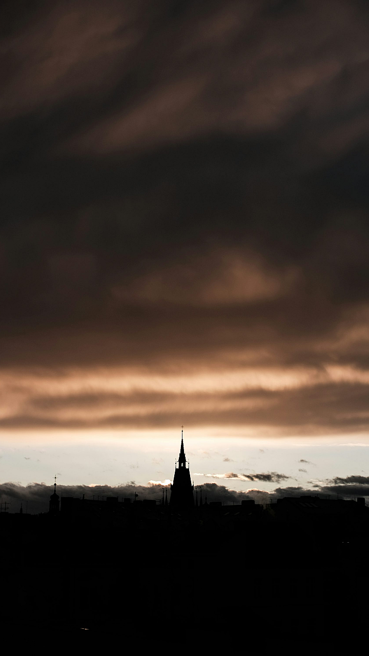 silhouette, tower, clouds, gray clouds, storm clouds, overcast, daytime, building, structure, skyscraper, high-rise, architecture, dark silhouette, dramatic, wallpaper
