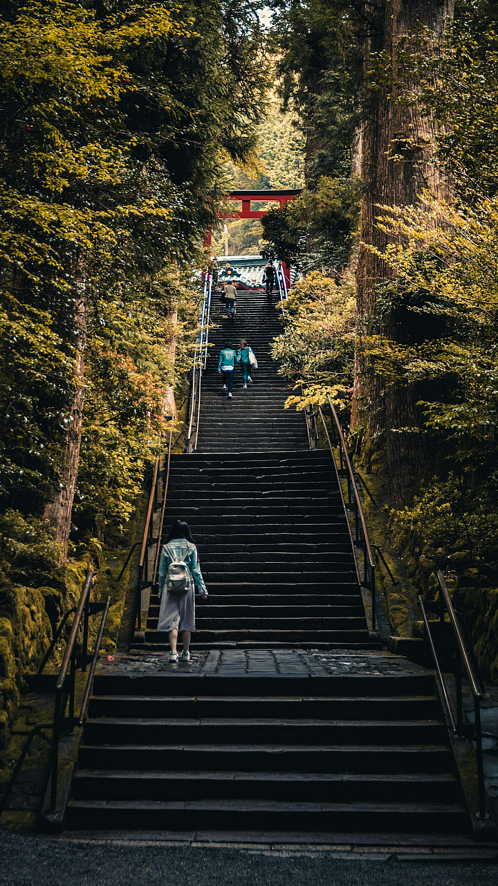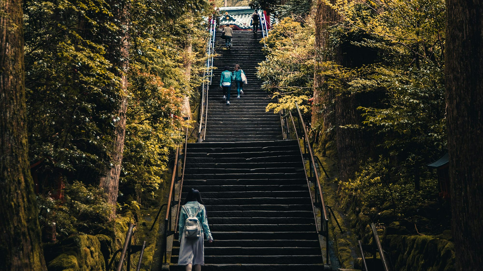 This wallpaper features a captivating scene of three individuals leisurely walking up a staircase nestled amidst a lush backdrop of green trees. The image evokes a sense of tranquility and adventure, showcasing the beauty of nature. The pathway winds its way through a verdant forest, creating a picturesque setting. The ascent up the stairs adds a dynamic element to the composition.