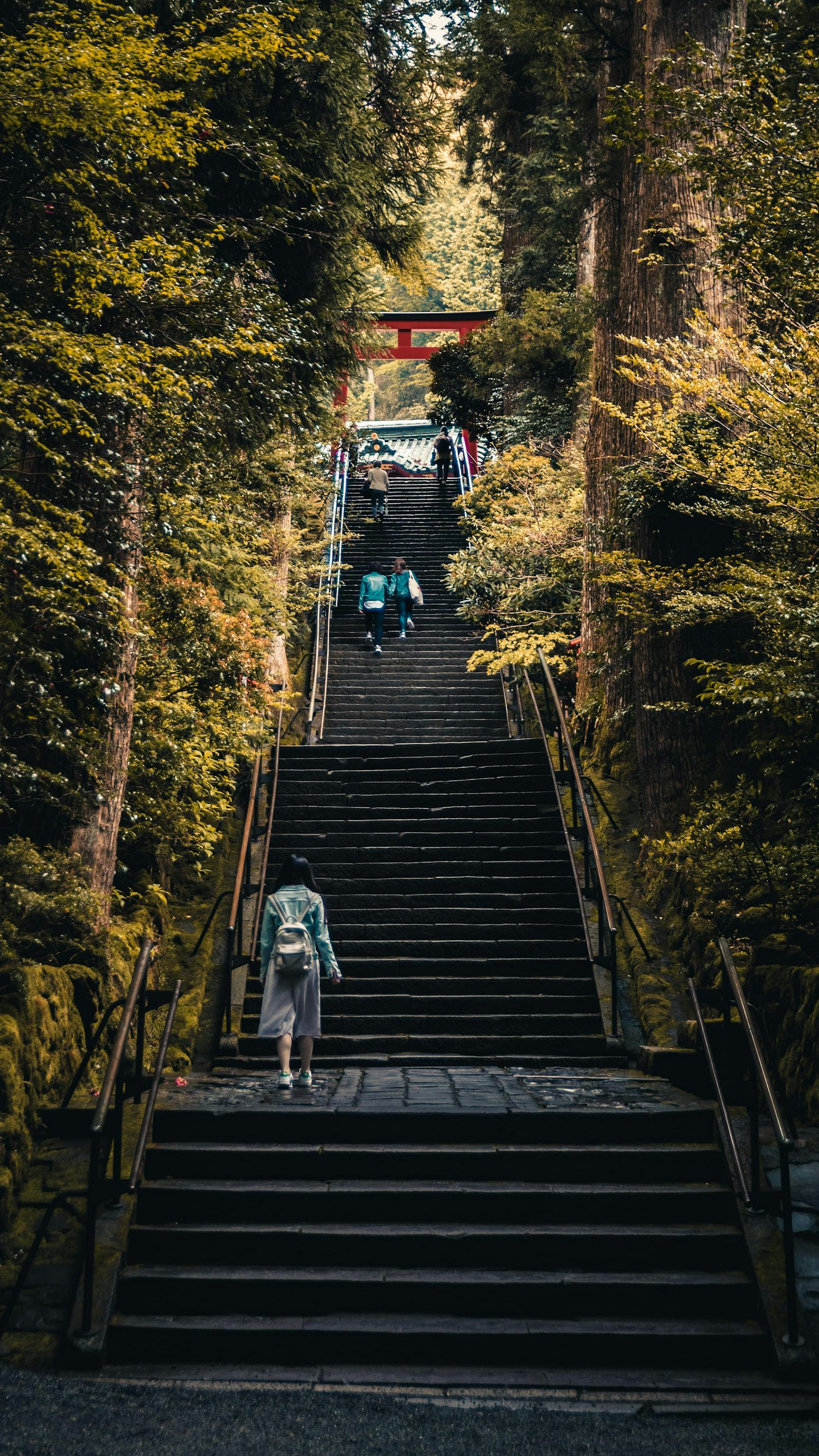 Keywords: three people, walking, stairs, green trees, nature, forest, path, pathway, ascent, climb, outdoors, landscape, scenery, hiking, trekking