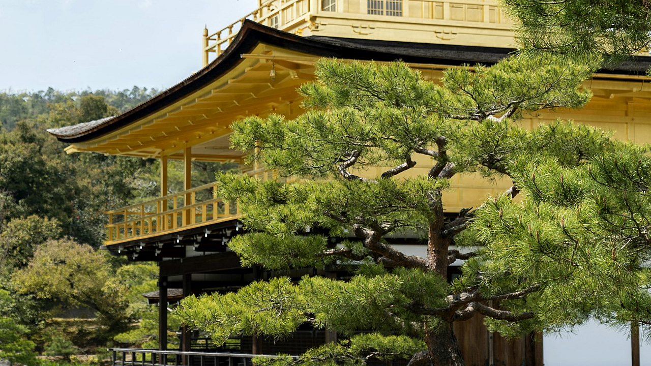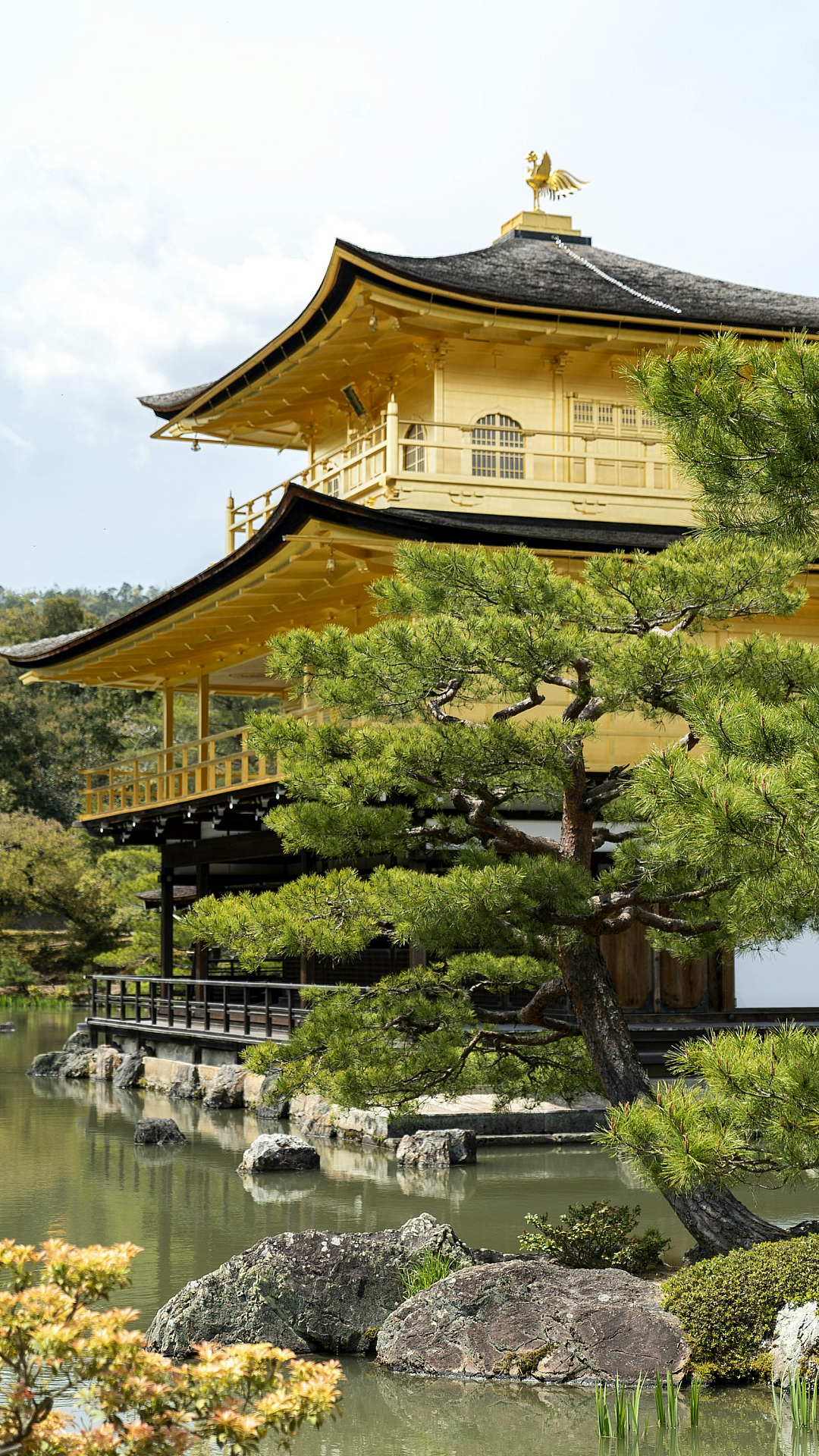 The bright yellow of the building stands out beautifully against the natural greens and blues, creating a captivating contrast. The scene suggests a calm and quiet environment, perfect for relaxation and contemplation. The detailed rendering of the building’s architecture, the water’s reflection, and the foliage all contribute to the overall beauty and appeal of the wallpaper.